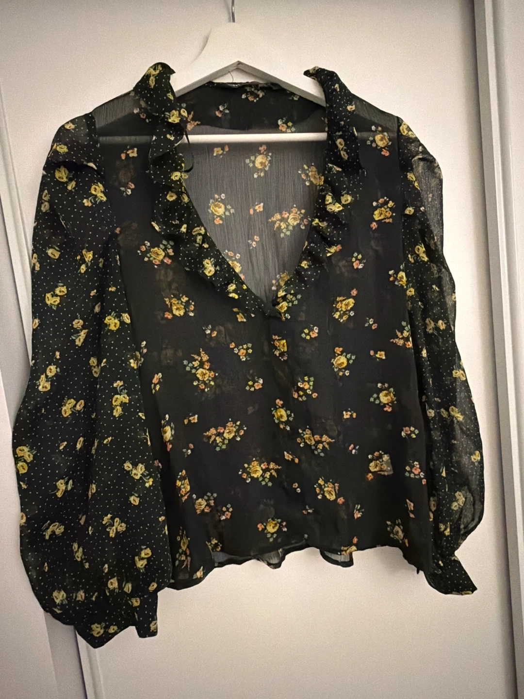 This sheer black chiffon blouse features a delicate floral print with yellow roses and small white polka dots on the sleeves. It has a V-neckline with a ruffled trim. The material is lightweight and flowy. It's a stylish piece for layering or dressing up.