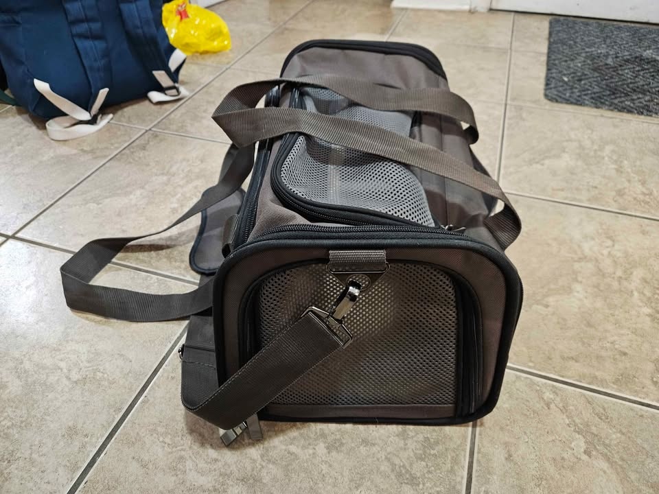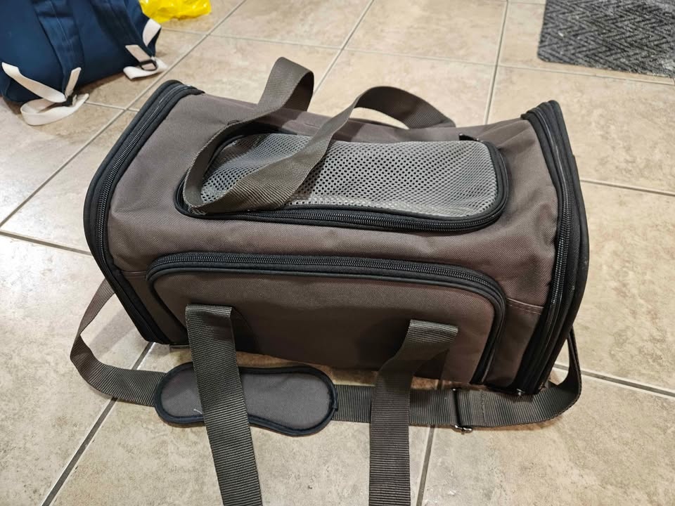Soft pet carrier for airplane with great features. Fits underneath the seat. The only teared part is included in the photos, but no effect on functionality. Dimensions: Width 40.5cm, Length 25.5cm, Height 23.5cm. Weight: 1kg. Pickup available at St. Clair West, St. George, or North York Centre stations depending on the day.
