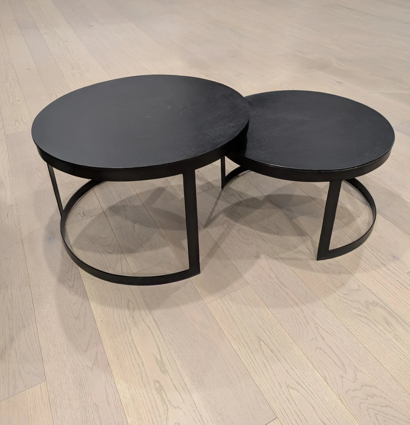 This set includes two nesting round coffee tables. They are black with a metal frame. The tables can be used together or separately.