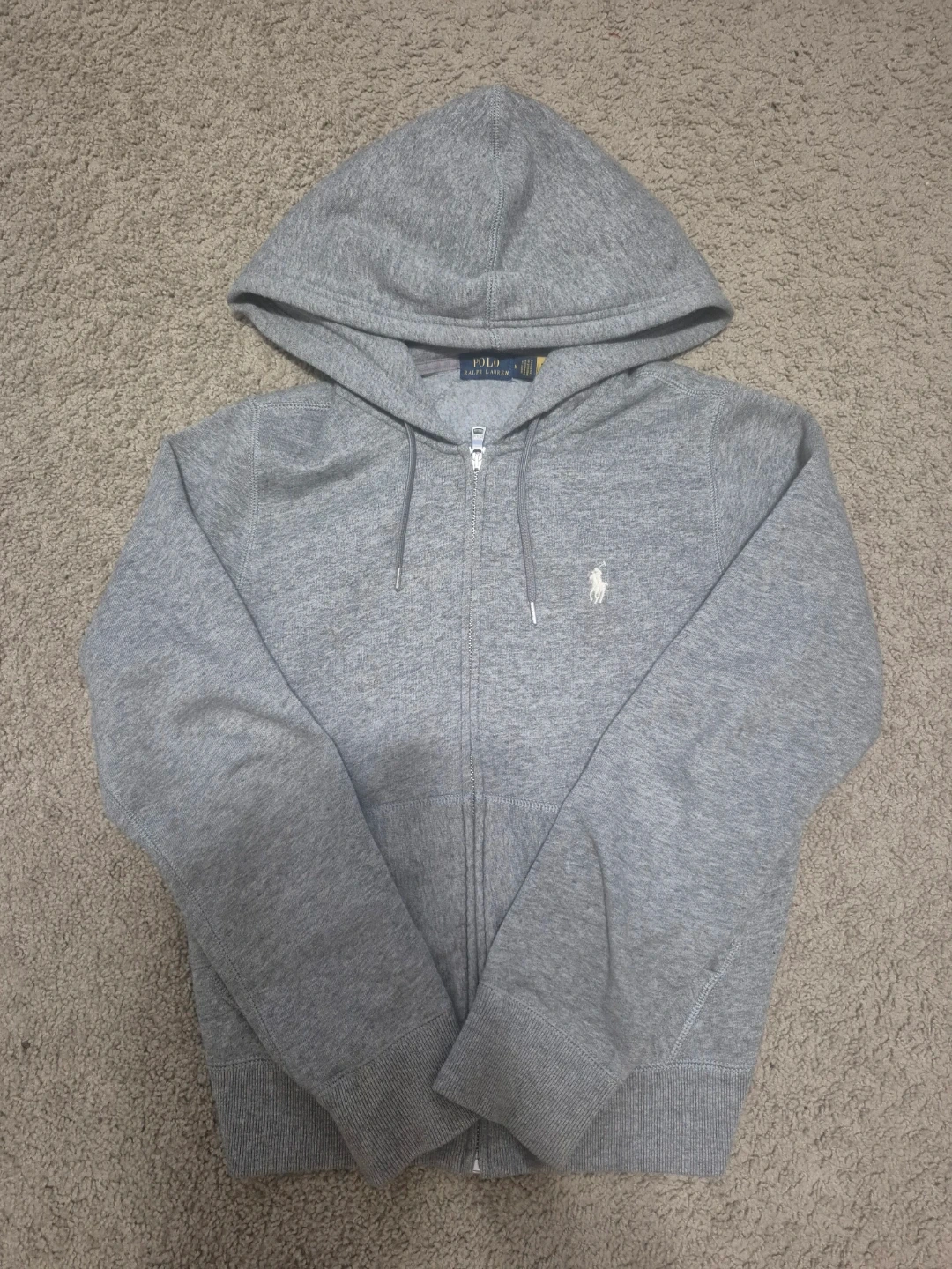 Grey Ralph Lauren Polo zip-up hoodie with a classic embroidered pony logo. It's made of a soft, comfortable fabric blend. This hoodie is great for casual wear or layering.