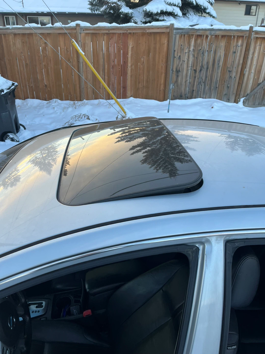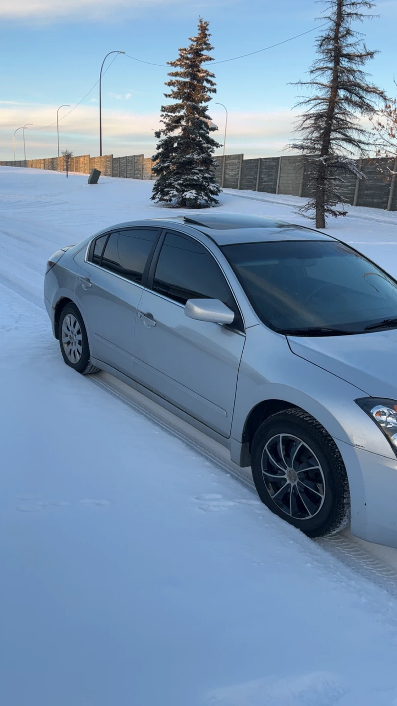 Selling a silver Nissan Altima sedan. It has a sunroof and black leather interior. Great for getting around town!