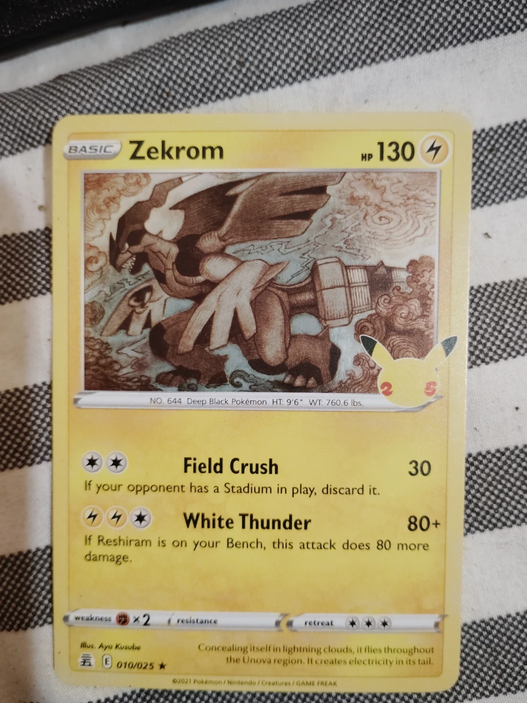 This is a Zekrom card from the Pokémon Trading Card game. It's a basic card with 130 HP. The card features two attacks: Field Crush and White Thunder. The artwork is by Aya Kusube.