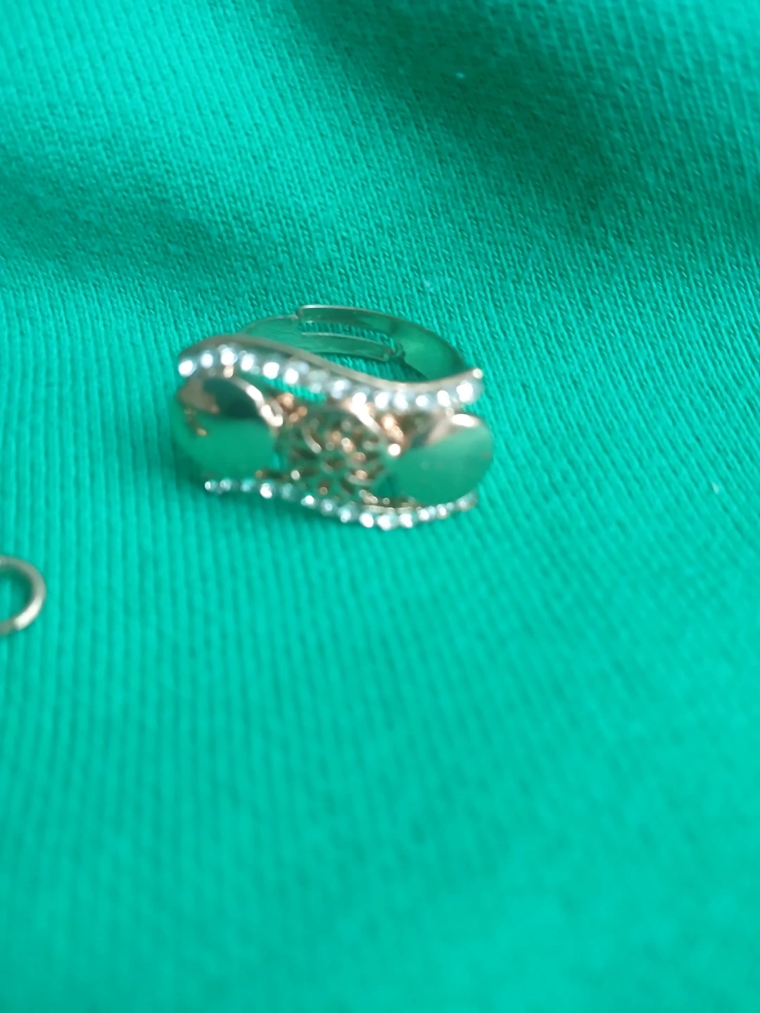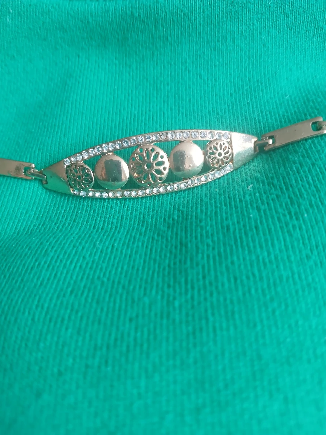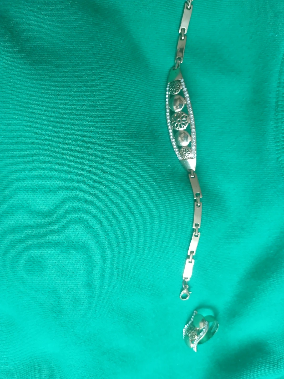 Selling a bracelet and ring set. The bracelet has a unique design with decorative elements and small stones. The ring complements the bracelet with a matching design. Both pieces are in good condition and ready to accessorize your outfits!