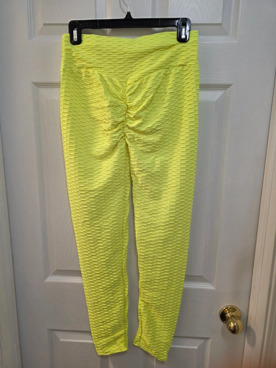 These textured leggings are a bright neon yellow colour. They're made with spandex and polyester. These leggings are great for workouts or casual wear!