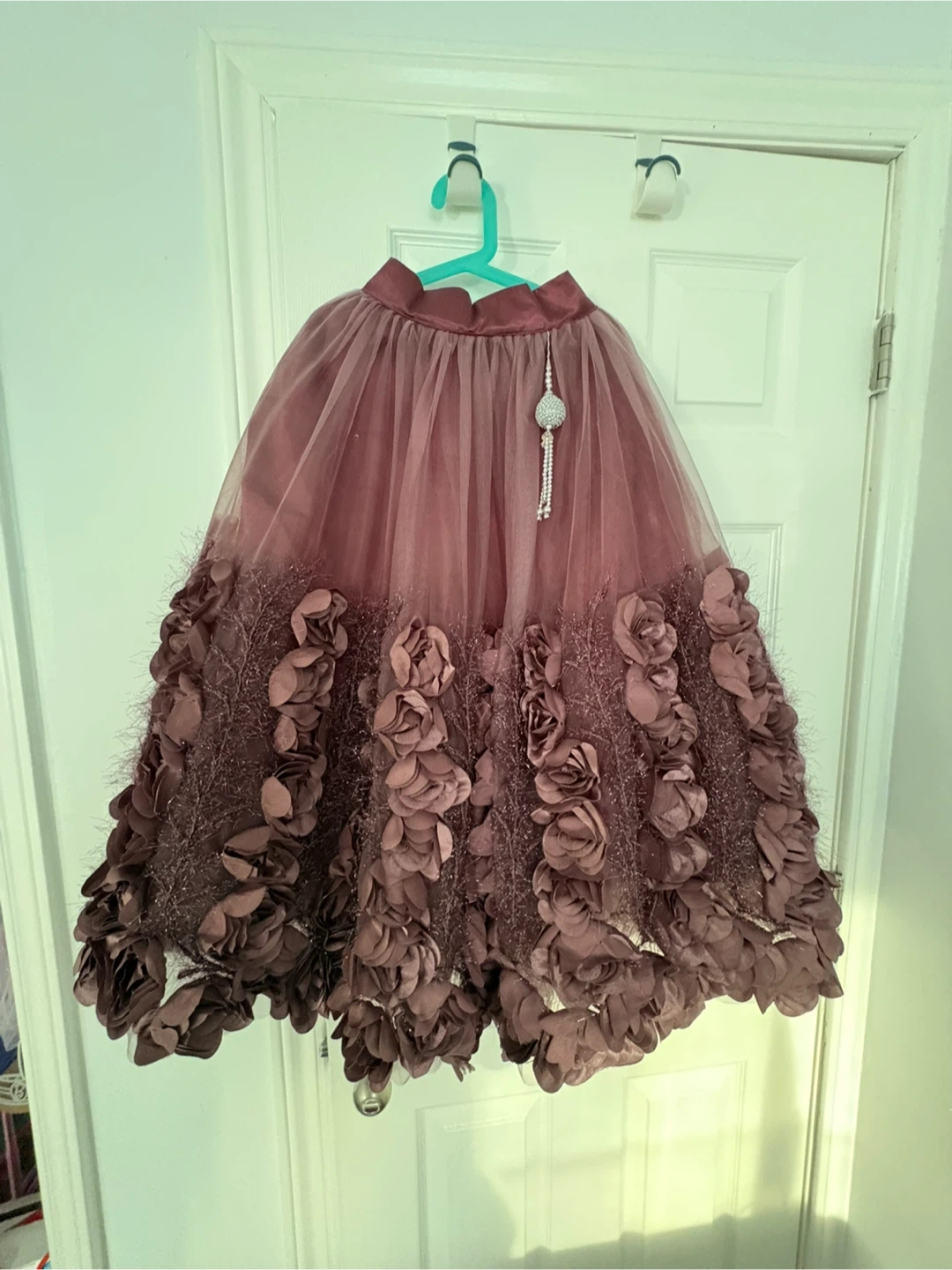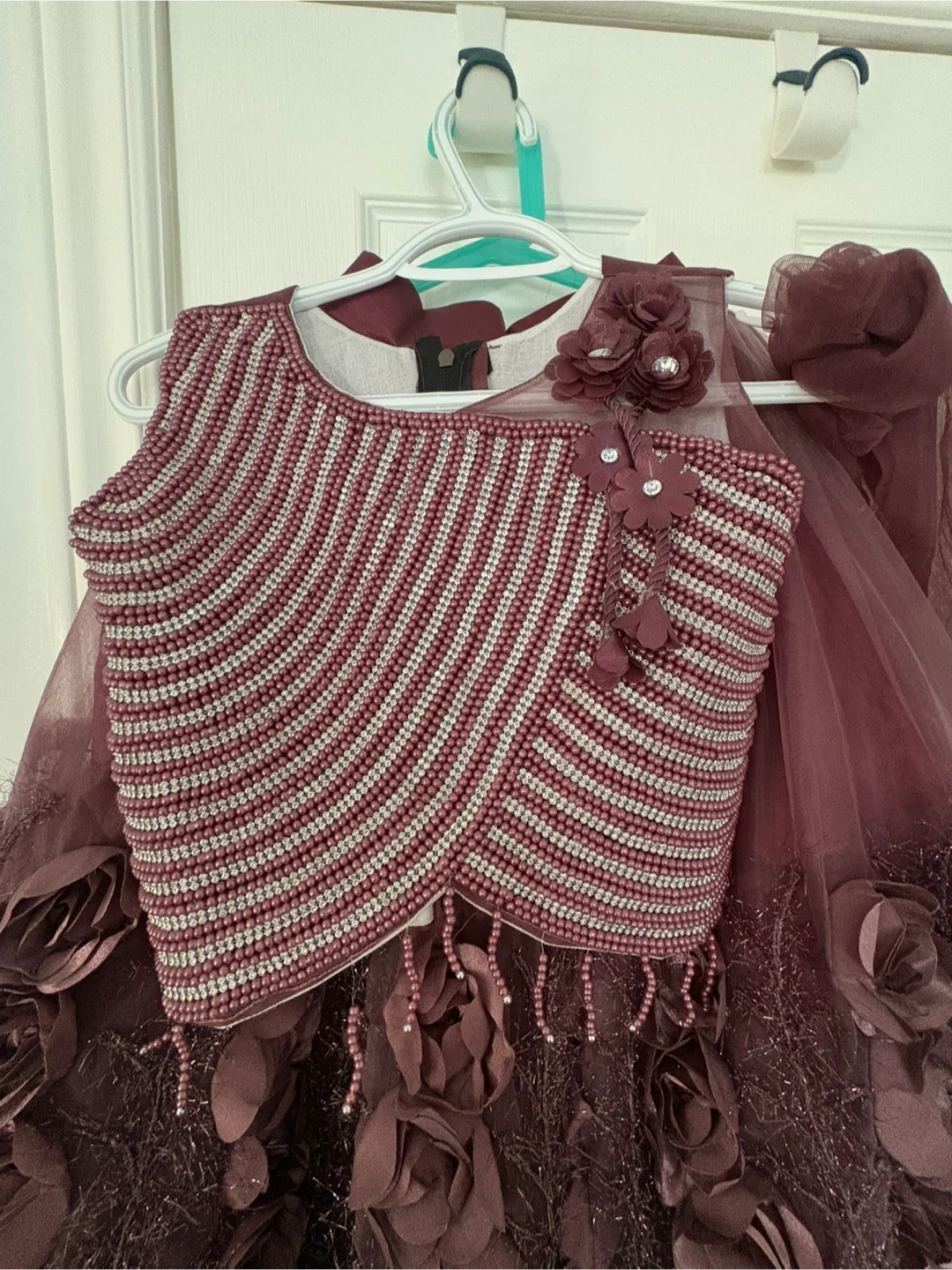 This gorgeous set features a richly embellished bodice with beads and sequins, paired with a voluminous tulle skirt adorned with 3D floral appliques. It's a stunning outfit perfect for special occasions. The skirt has a satin waistband and layered tulle for a full look.