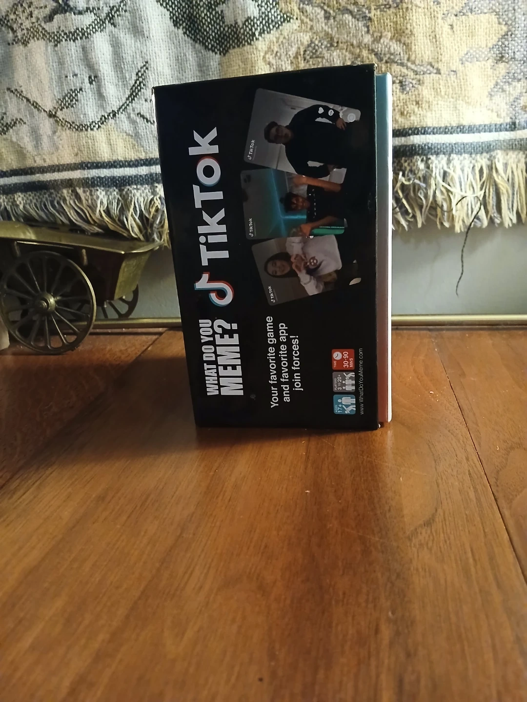 This is the What Do You Meme? TikTok Edition card game. It's designed for ages 17 and up. Players can join forces to create hilarious TikTok-themed memes.