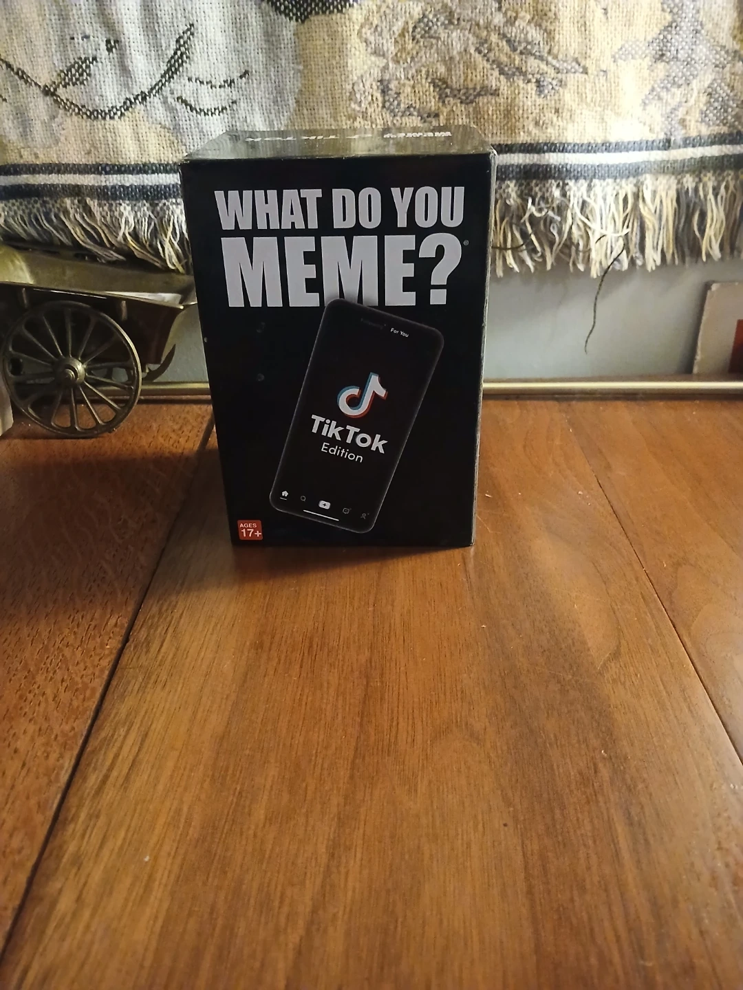 This is the What Do You Meme? TikTok Edition card game. It's designed for ages 17 and up. Players can join forces to create hilarious TikTok-themed memes.