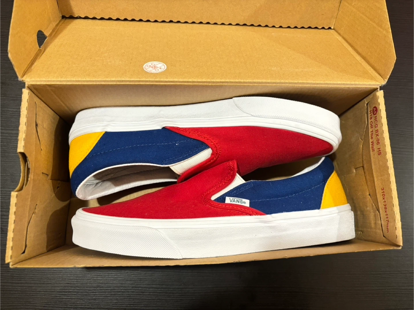 These are Vans Classic Slip-On sneakers in a red, blue, and yellow colourway. They come with the original box. This style is great for everyday wear!