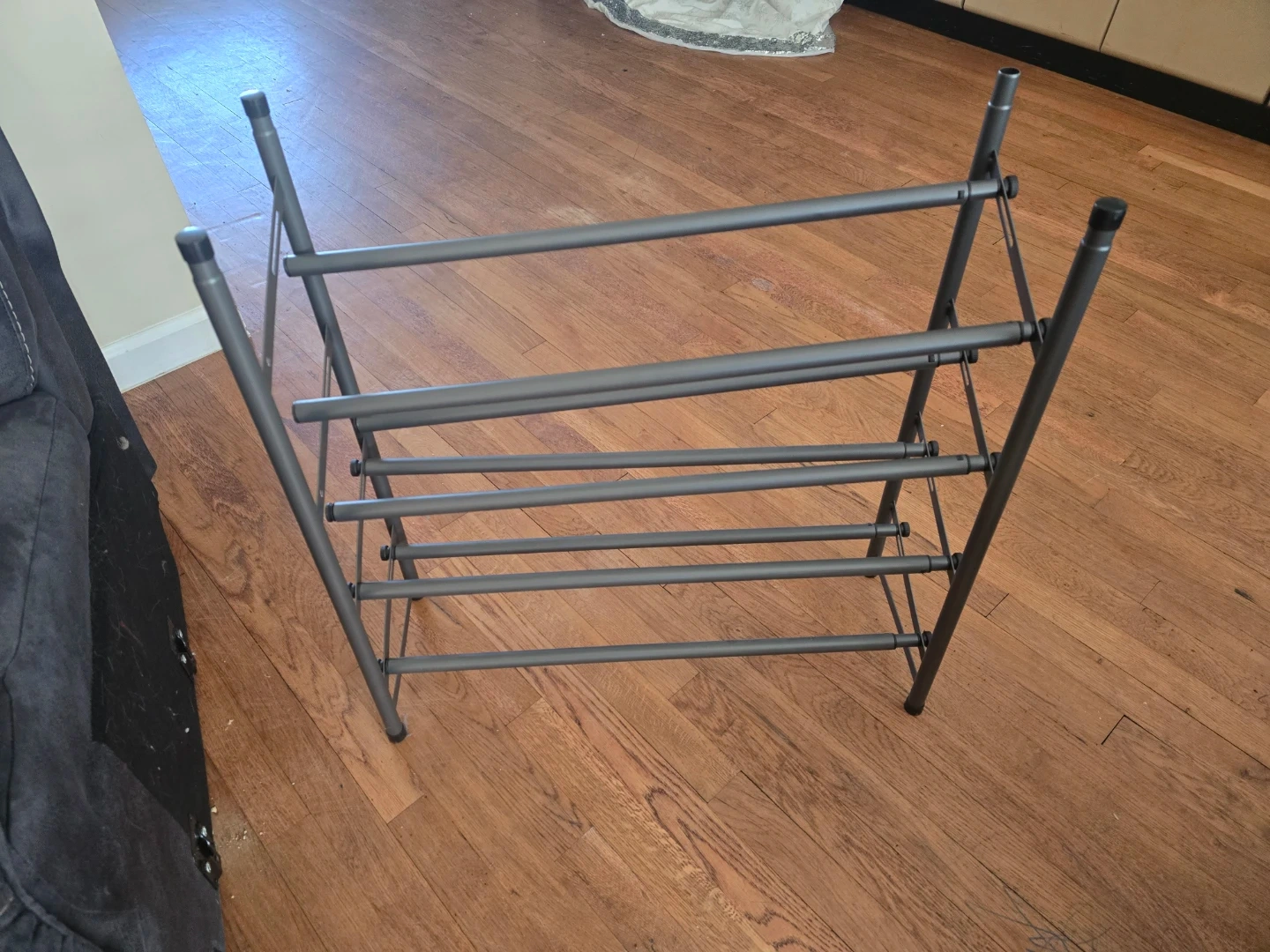 This is a 4-tier metal shoe rack. It's gray and made of metal. It's great for organizing shoes. This rack provides ample space for multiple pairs of footwear.