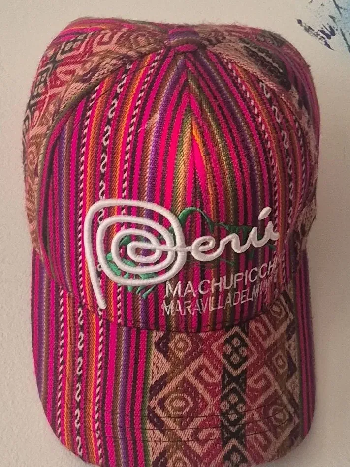 Casquette de style péruvien avec un motif coloré. L'inscription "Pérou Machu Picchu Maravilladelmundo" est brodée sur le devant. Elle est faite de tissu avec des motifs ethniques.