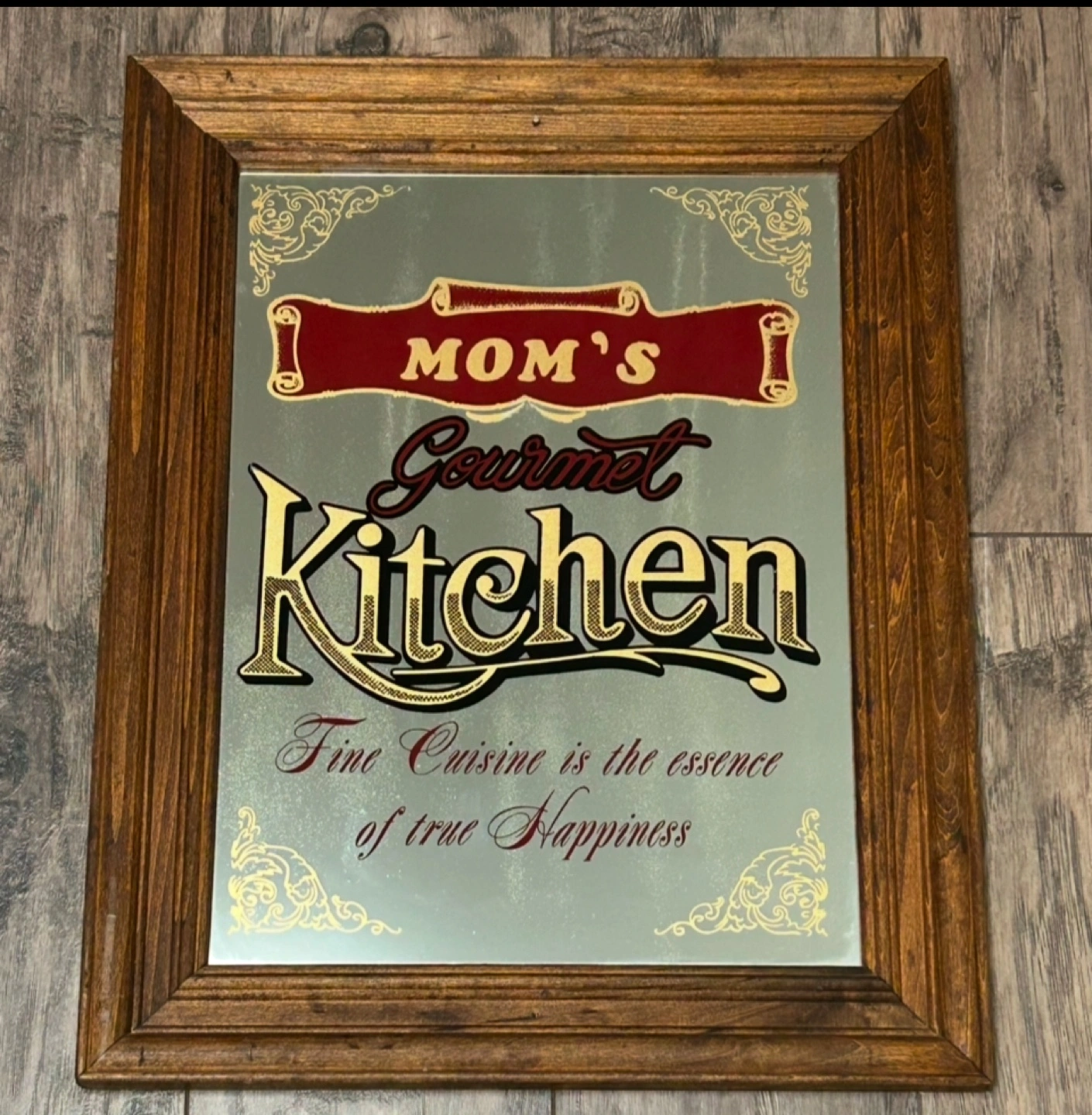 Framed mirror with decorative lettering. Features the phrase Mom's Gourmet Kitchen. Fine Cuisine is the essence of true happiness quote. Dark wood frame. Great for kitchen decor.