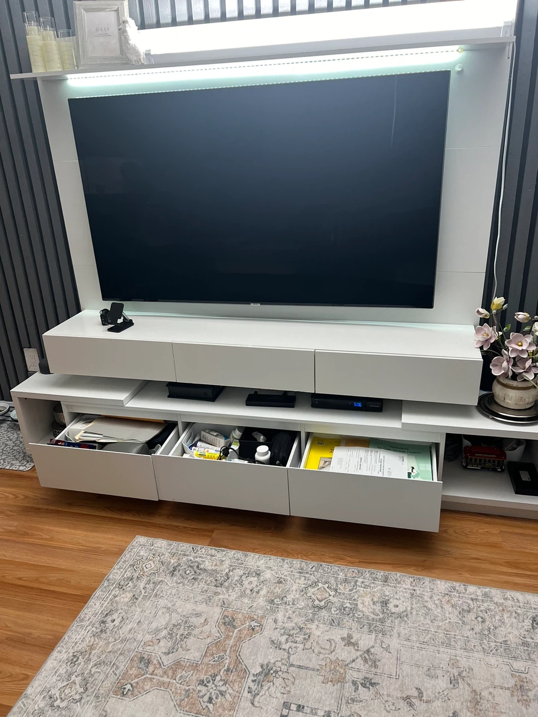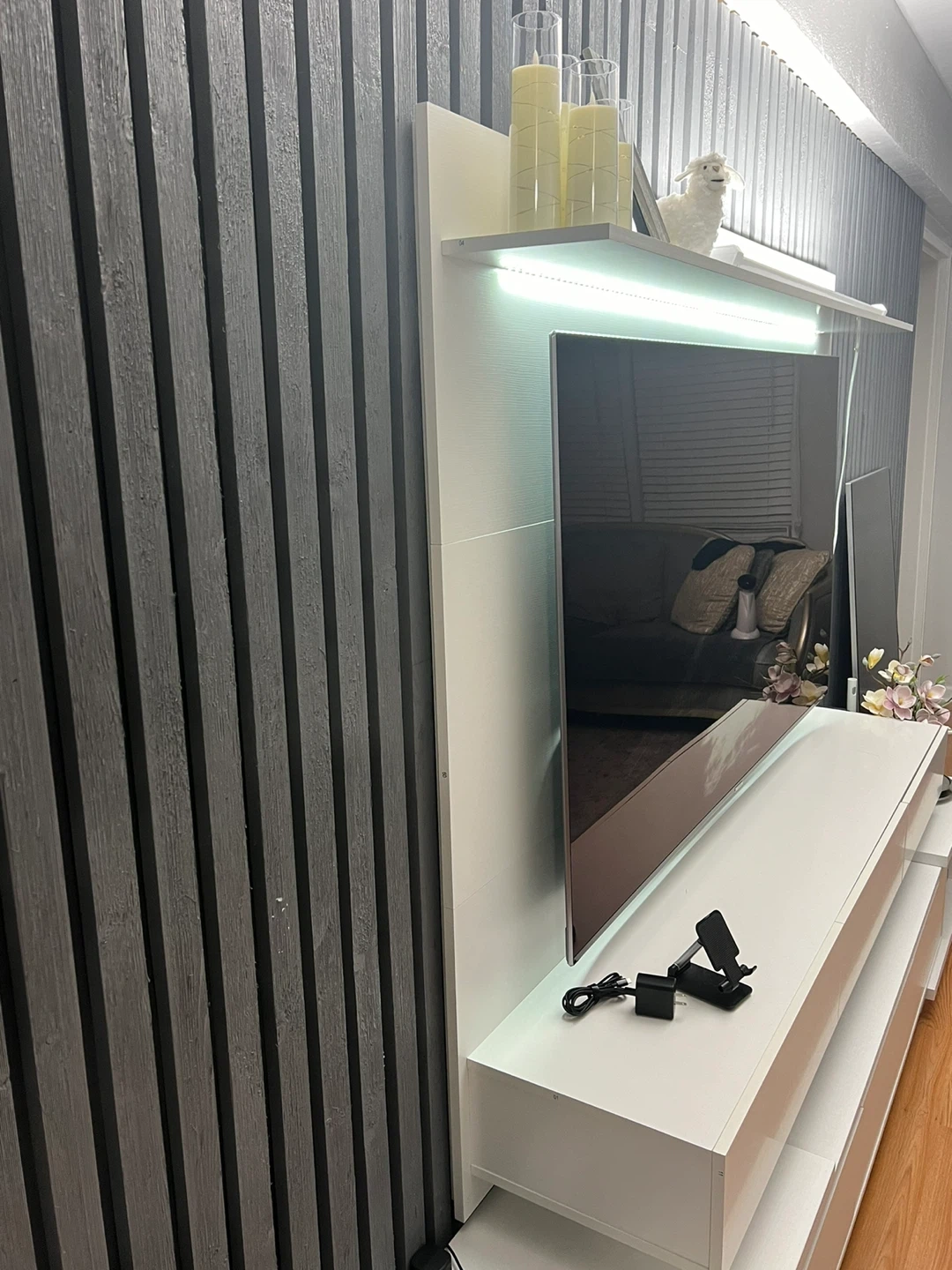Selling a white TV stand wall mounted entertainment center! It has a modern design with integrated LED lighting tv not included.The unit offers ample storage with multiple drawers and shelves. It’s perfect for organizing your media devices and accessories while adding a stylish touch to your living room the bottom pc extended for bigger size any questions please text me here pick up only