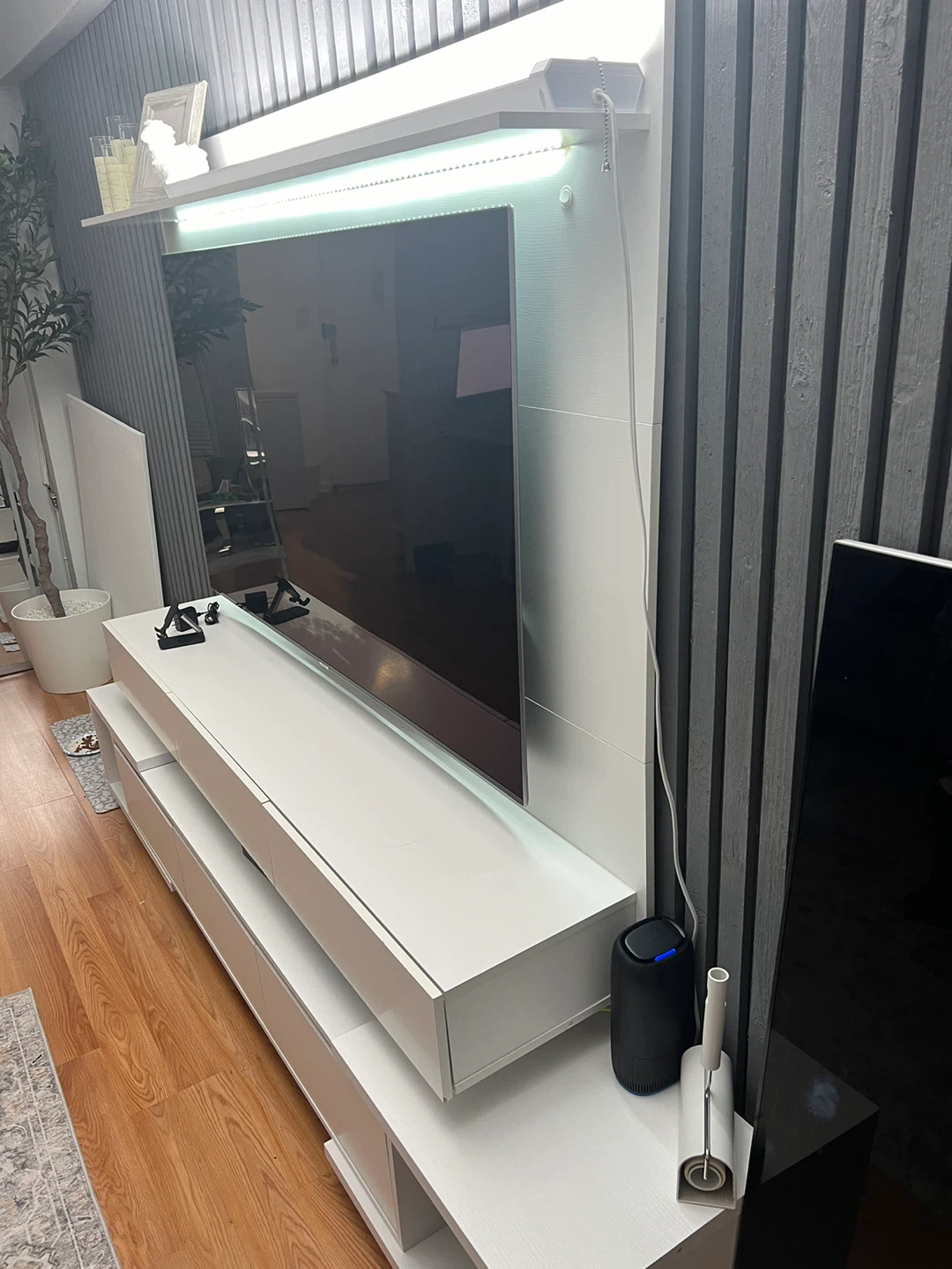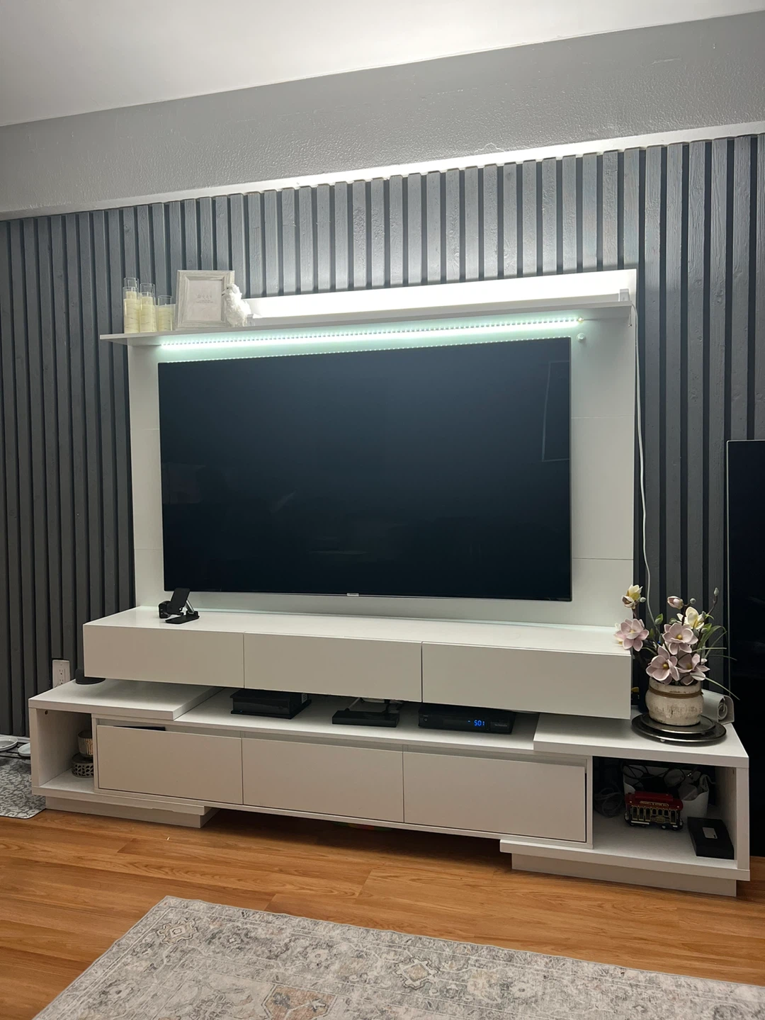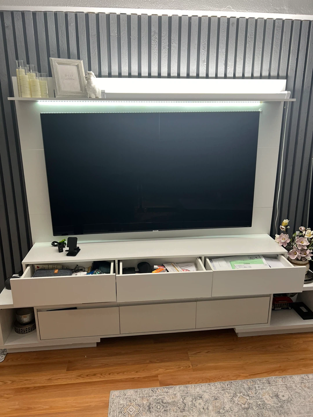 Selling a white TV stand wall mounted entertainment center! It has a modern design with integrated LED lighting tv not included.The unit offers ample storage with multiple drawers and shelves. It’s perfect for organizing your media devices and accessories while adding a stylish touch to your living room the bottom pc extended for bigger size any questions please text me here pick up only