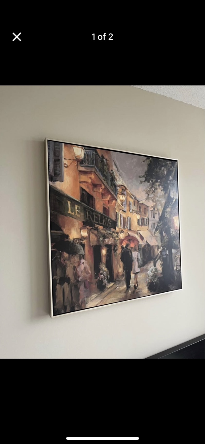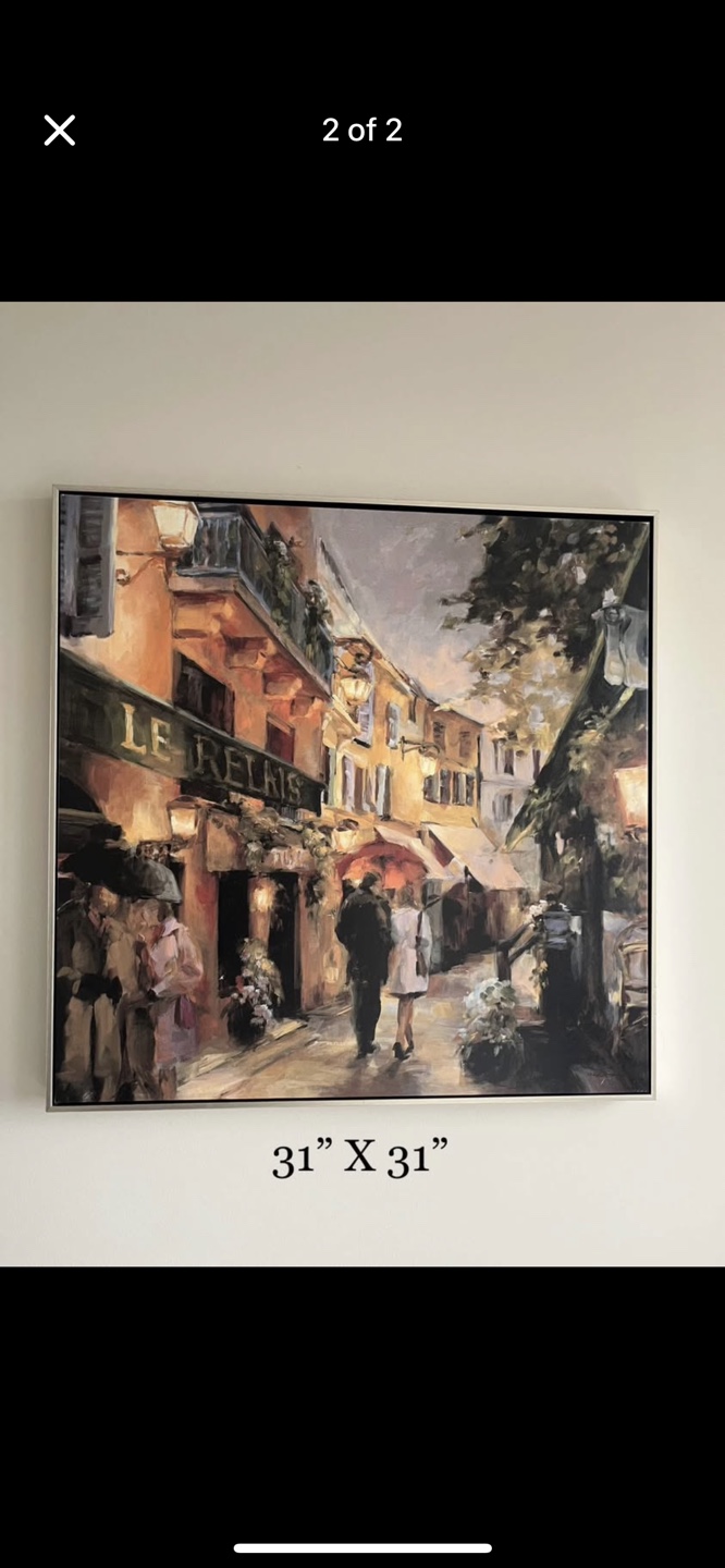 Beautiful large framed canvas print. Depicts a Parisian street scene at night. Measures 31" x 31". Neutral colours, silver frame.