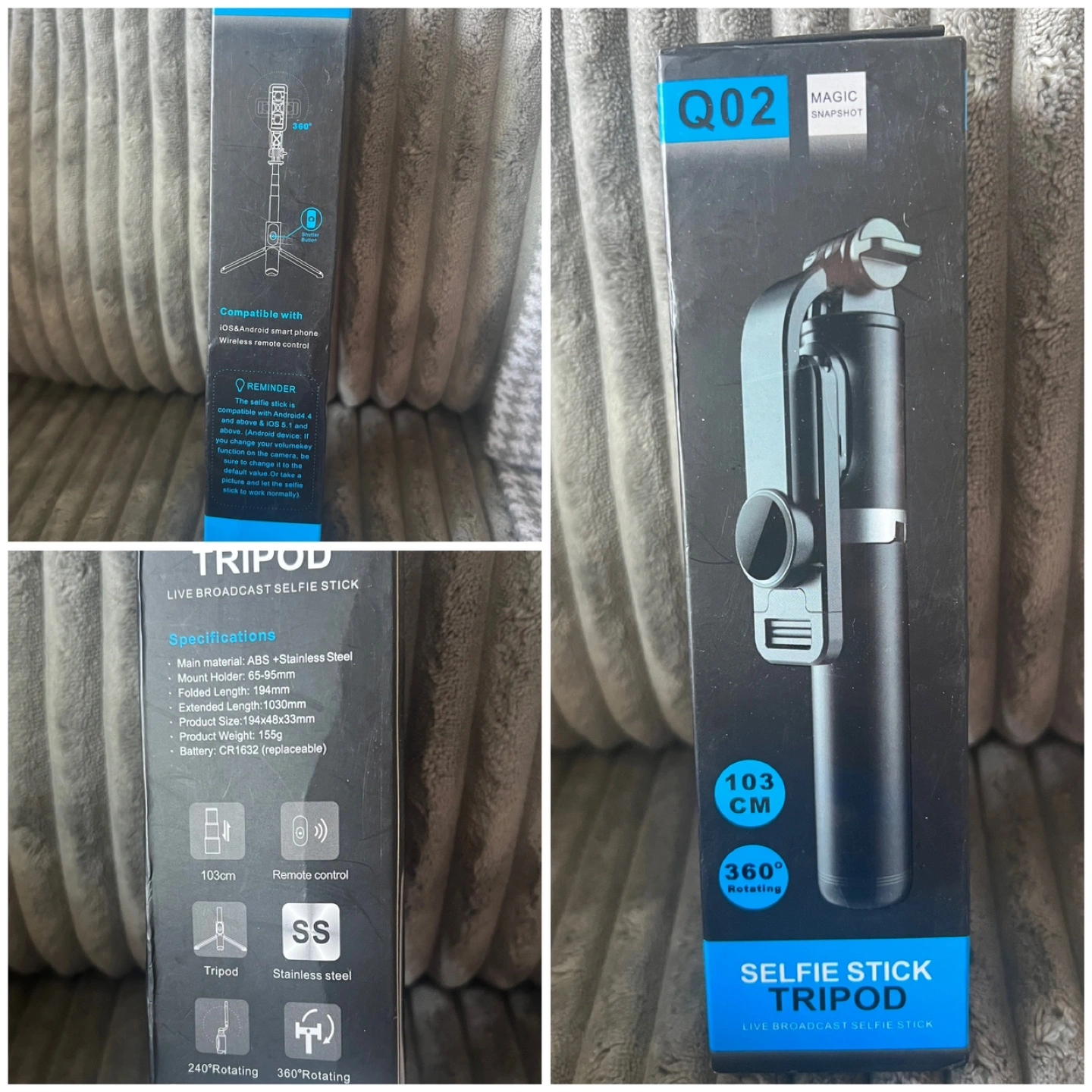 Brand new in box. A selfie stick that turns into a tripod. It rotates 360 degrees. Perfect for capturing memorable moments with ease.