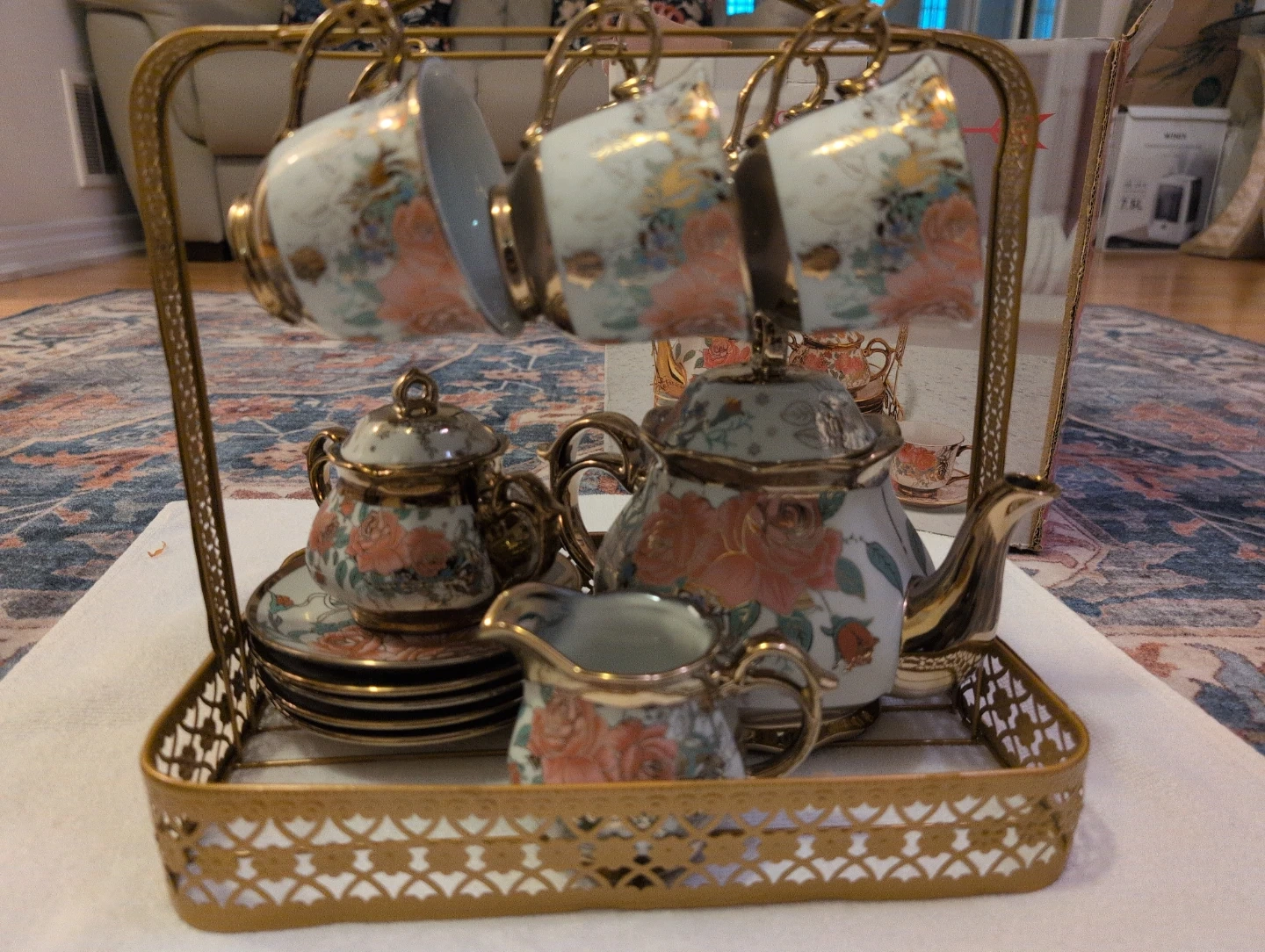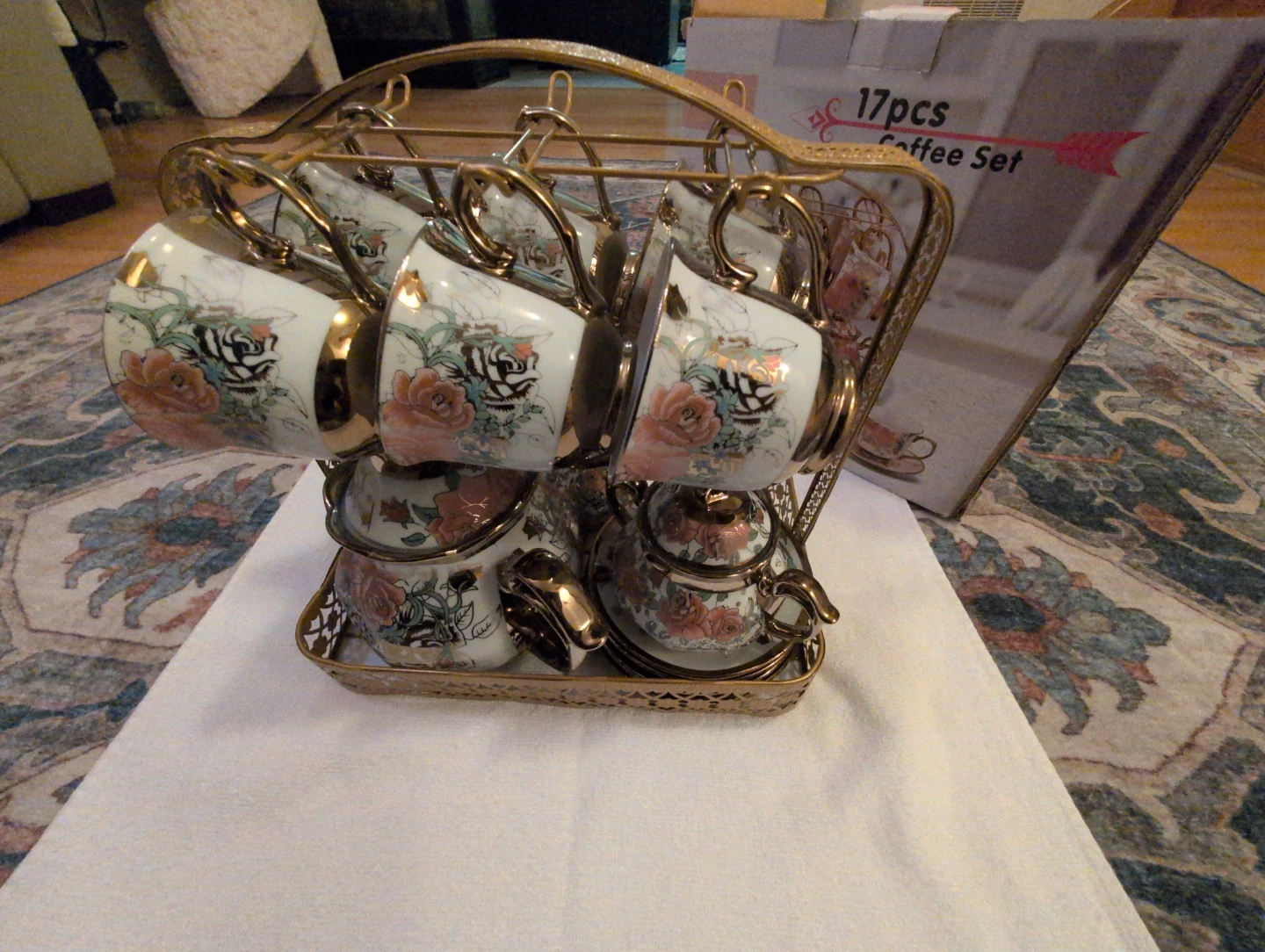 This elegant coffee and tea set includes 17 pieces for serving. It features a decorative floral pattern with gold trim. The set comes with cups, saucers, a teapot, a sugar bowl, and a creamer, all displayed on a gold metal stand. It's beautiful for any special occasion!