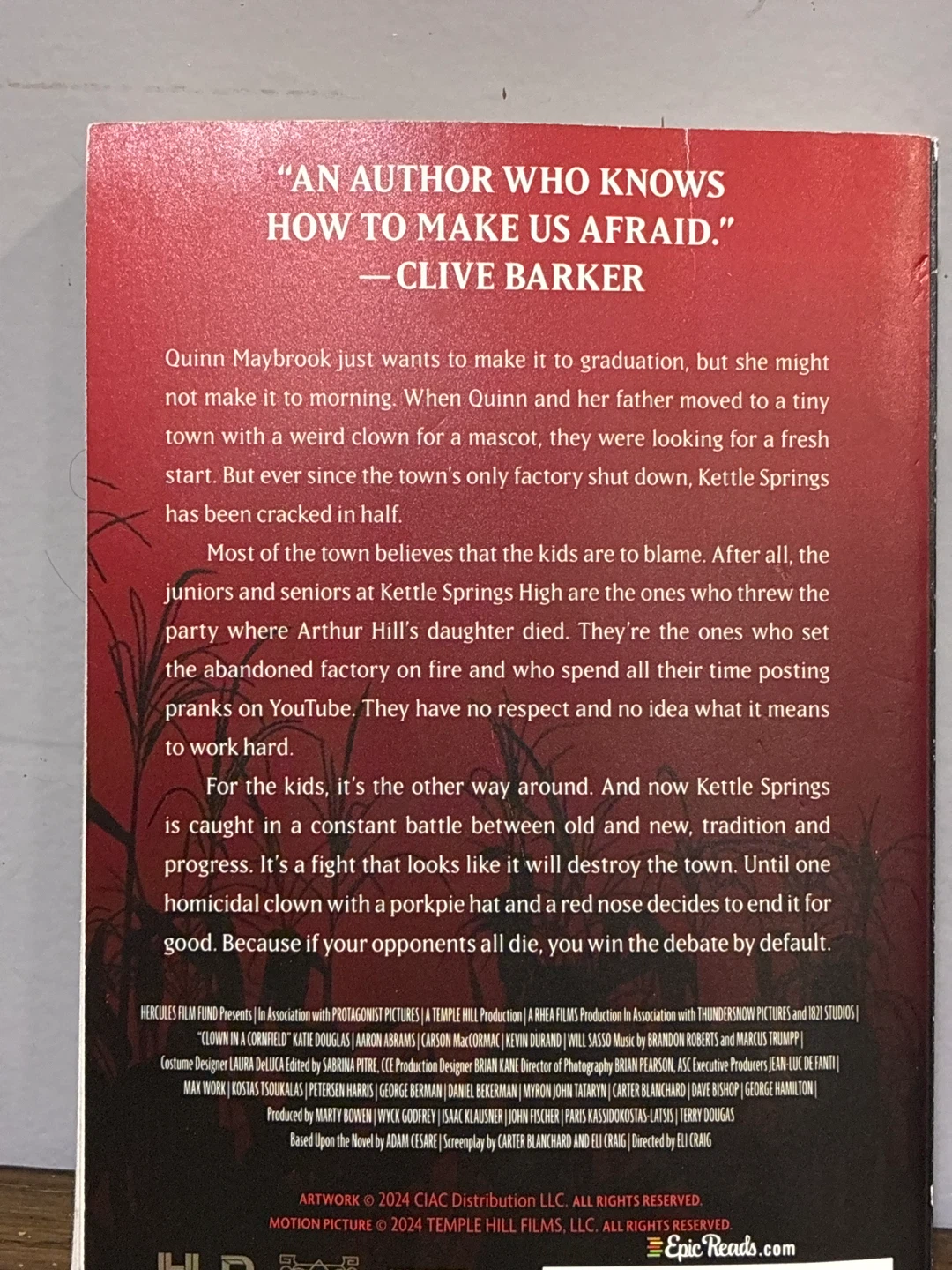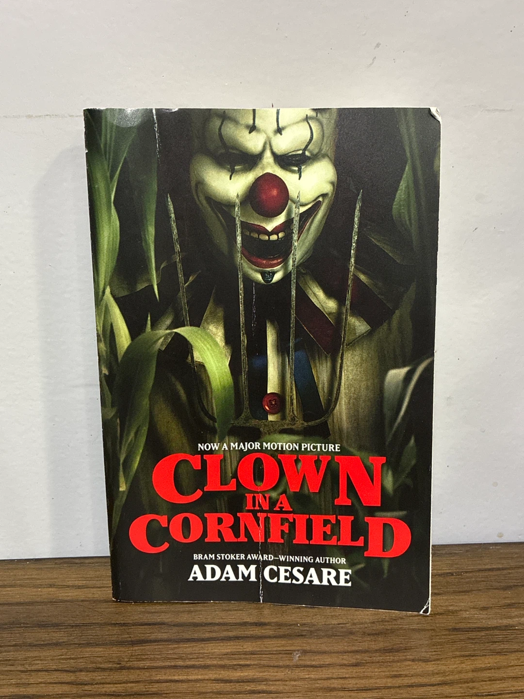 This is the paperback novel 'Clown in a Cornfield' by Adam Cesare. It's based on the motion picture. It's a thriller novel with a young adult target audience.