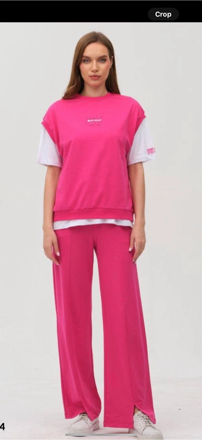 Selling a bright pink two-piece set from Oversized Wear! It includes a short-sleeved top and wide-leg pants. Perfect for a pop of colour in your wardrobe!