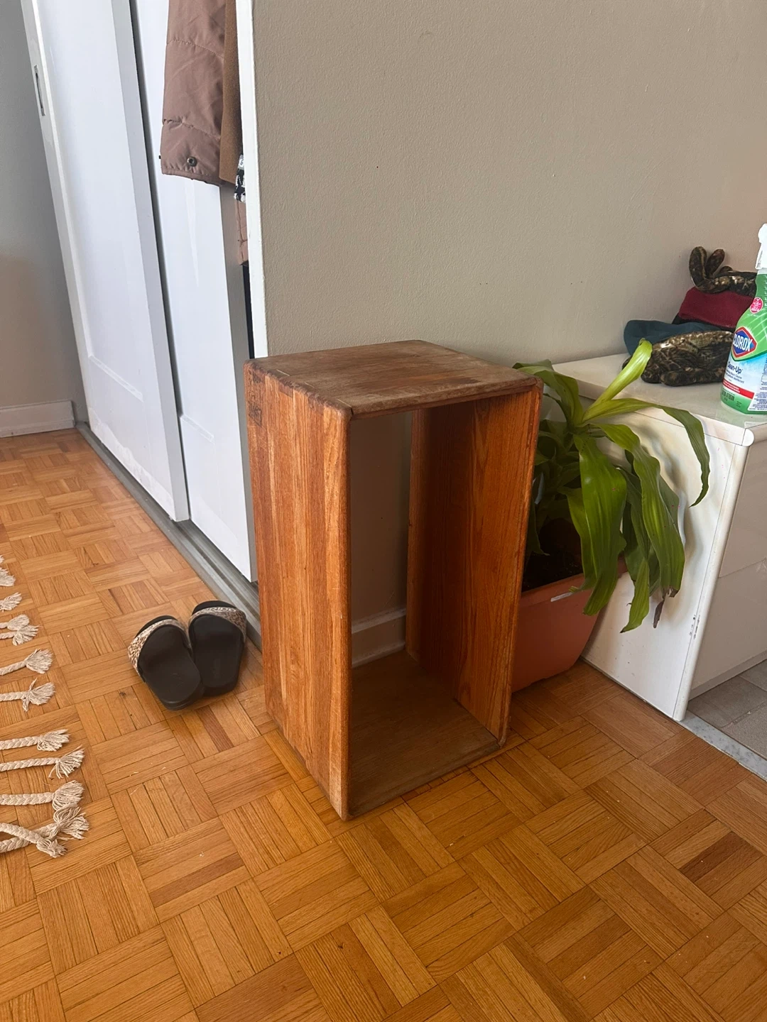 This is a simple wooden cube shelf with an open front. Its dimensions are 60cm x 30 cm x 30cm. It's made of wood and has a warm, natural finish. This item could be useful for displaying small plants or decorative items.