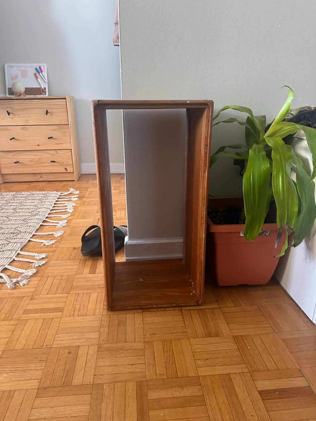 This is a simple wooden cube shelf with an open front. Its dimensions are 60cm x 30 cm x 30cm. It's made of wood and has a warm, natural finish. This item could be useful for displaying small plants or decorative items.