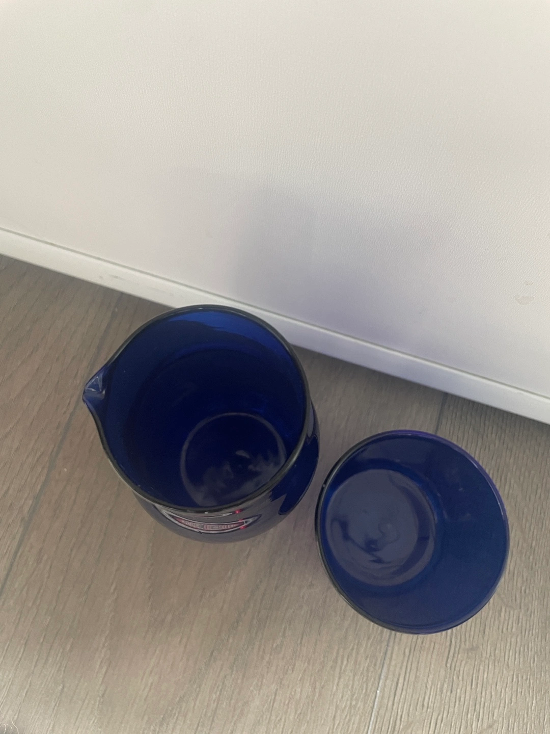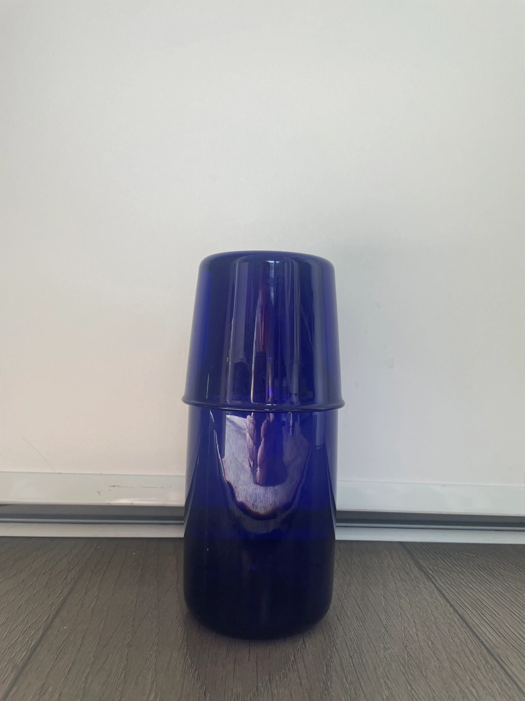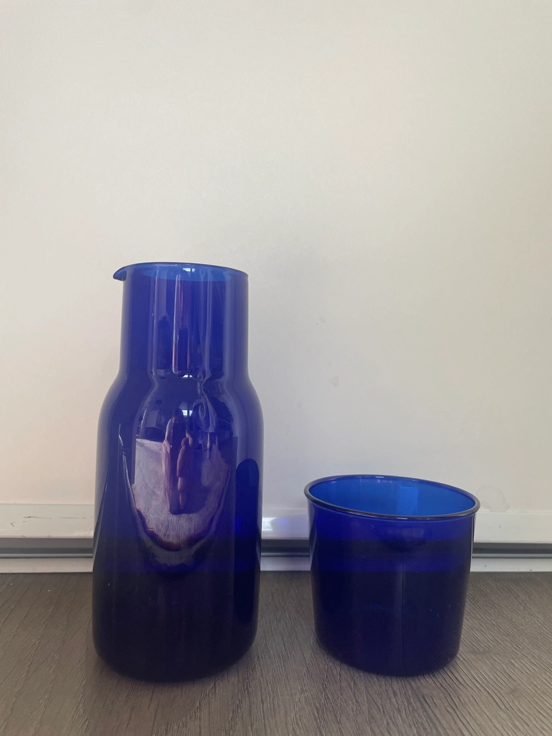 Blue glass pitcher and tumbler set. Both pieces are in excellent condition - perfect for gifting. The pitcher is just under 7 inches high, and the cup is 3 inches.