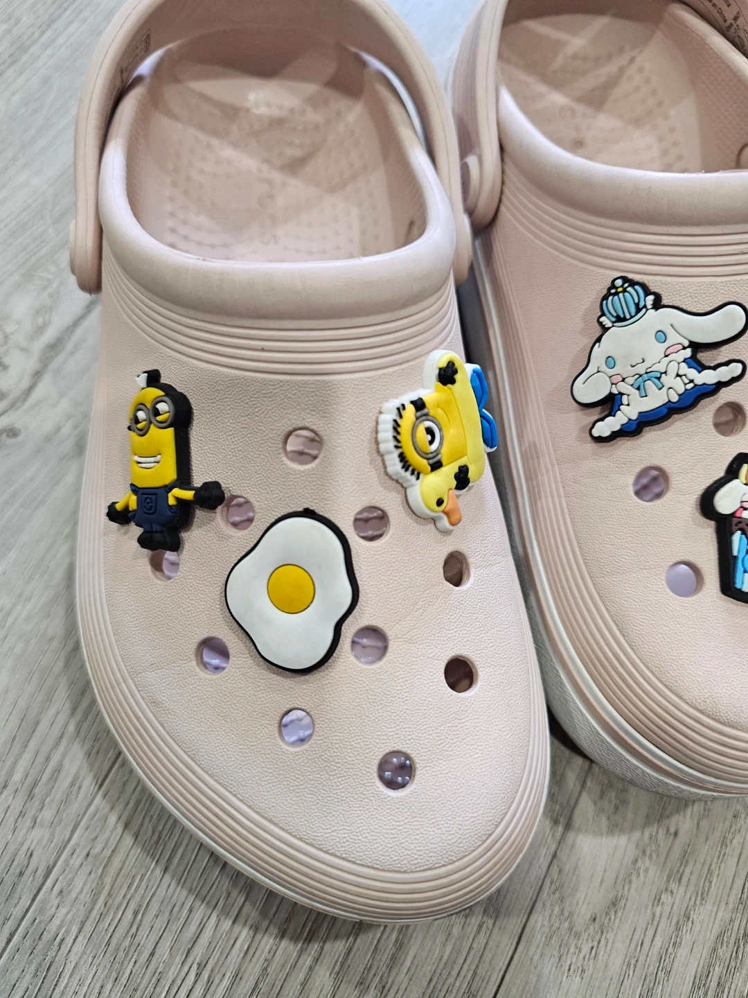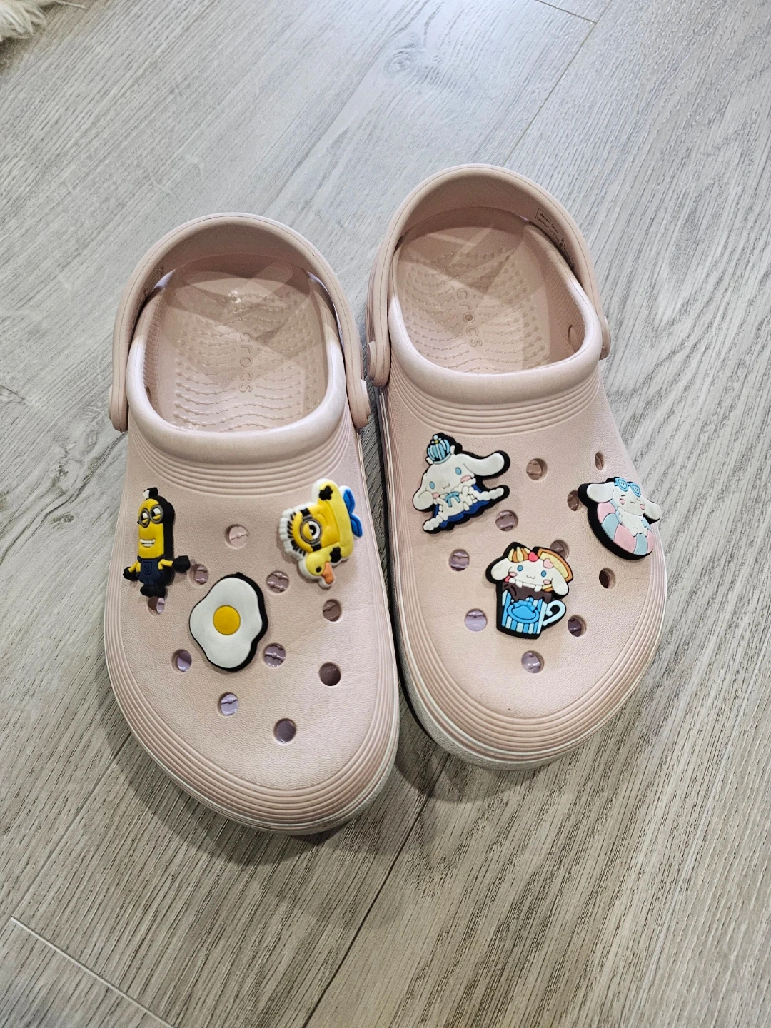 Pink Crocs clogs decorated with various colourful charms, including Minions and Cinnamoroll. These comfy slip-on shoes are perfect for casual wear. They're made from a durable, lightweight material. Easy to clean and wear!