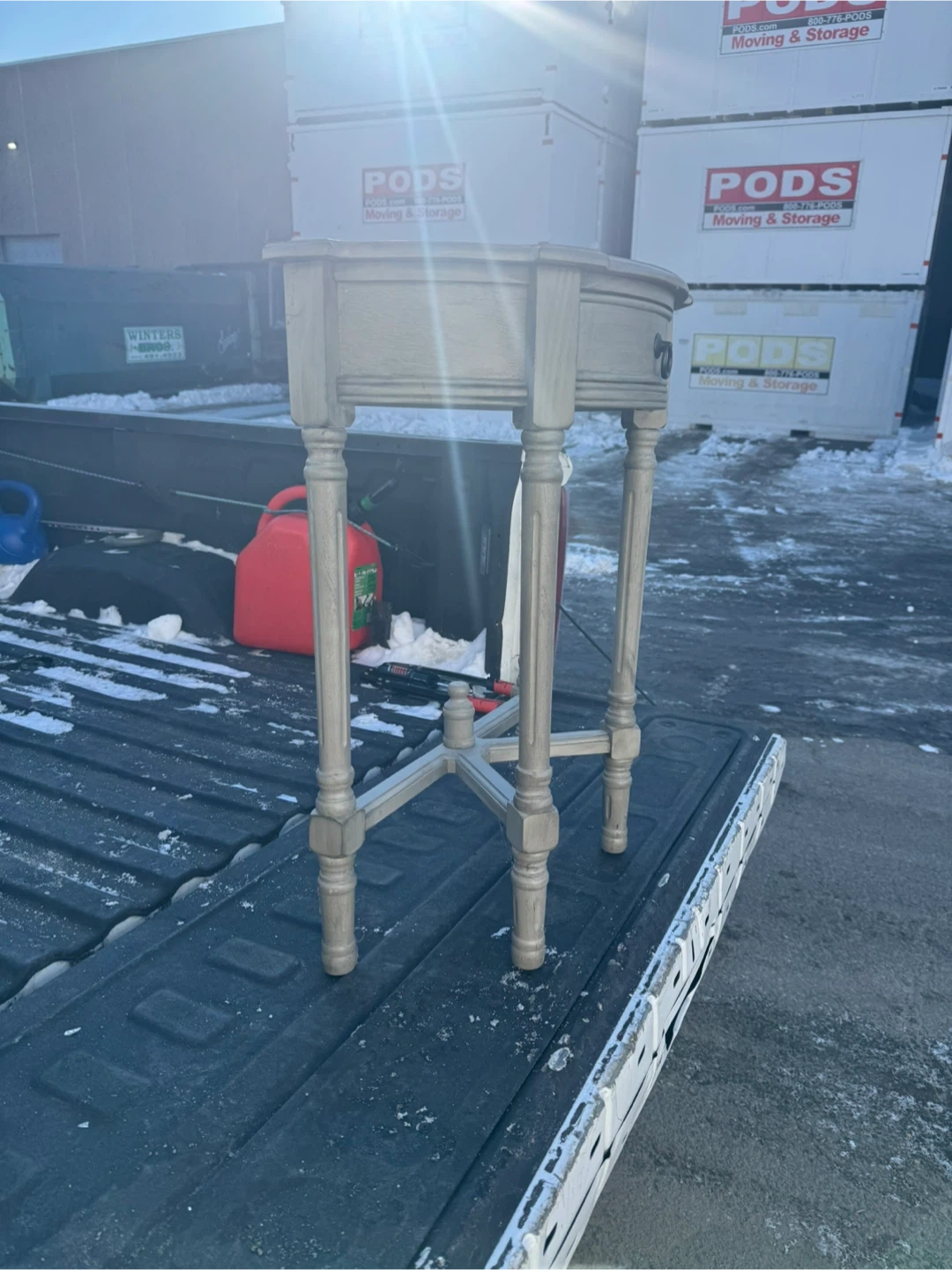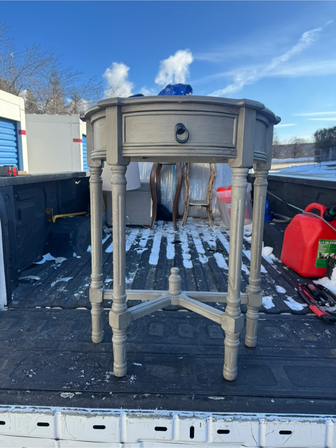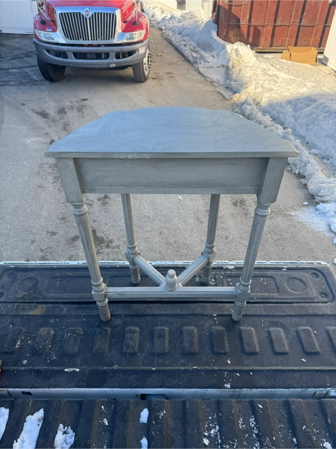 Gray accent table featuring a curved top and a single drawer with a metal pull. Legs are carved with decorative details.