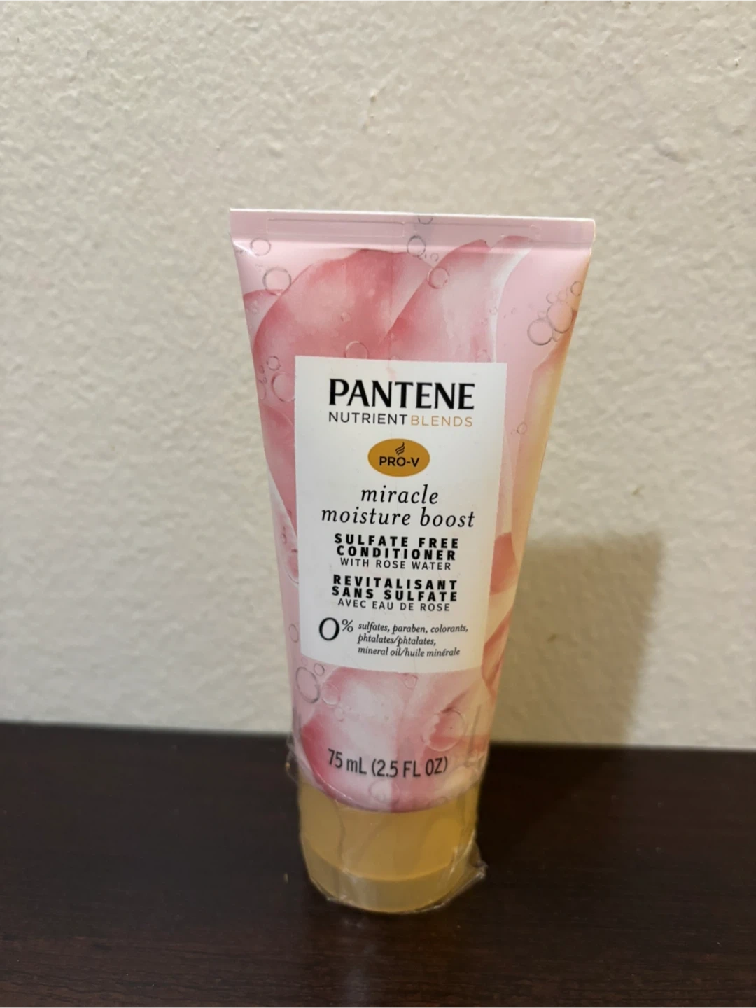 Pantene Nutrient Blends Miracle Moisture Boost Conditioner. It's sulfate free and made with rose water. Contains 0% sulfates, parabens, colorants, phthalates, or mineral oil. 75 mL (2.5 FL OZ) bottle.