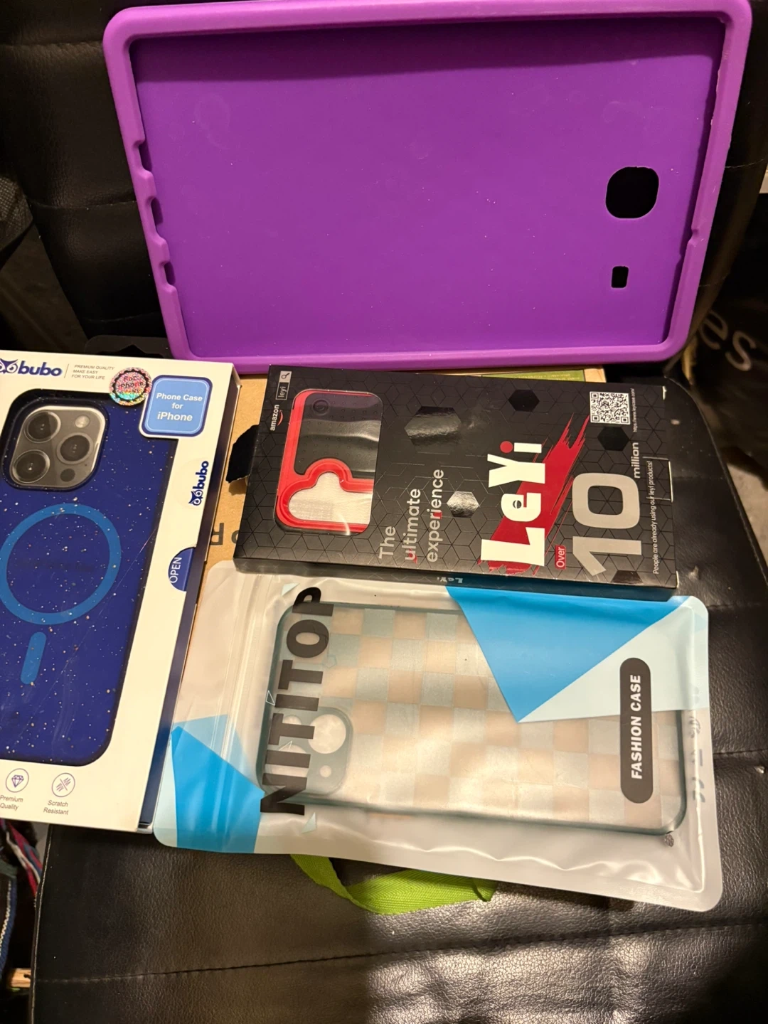 This lot includes a variety of phone cases. You'll find a purple rubberized case, a clear fashion case with a checkered pattern, and a blue glitter case with a magnetic ring. Also included is a red and black rugged case designed for phone protection. Cases are for different phone models, some branded by buuboo, NITITOP, and LeYi.