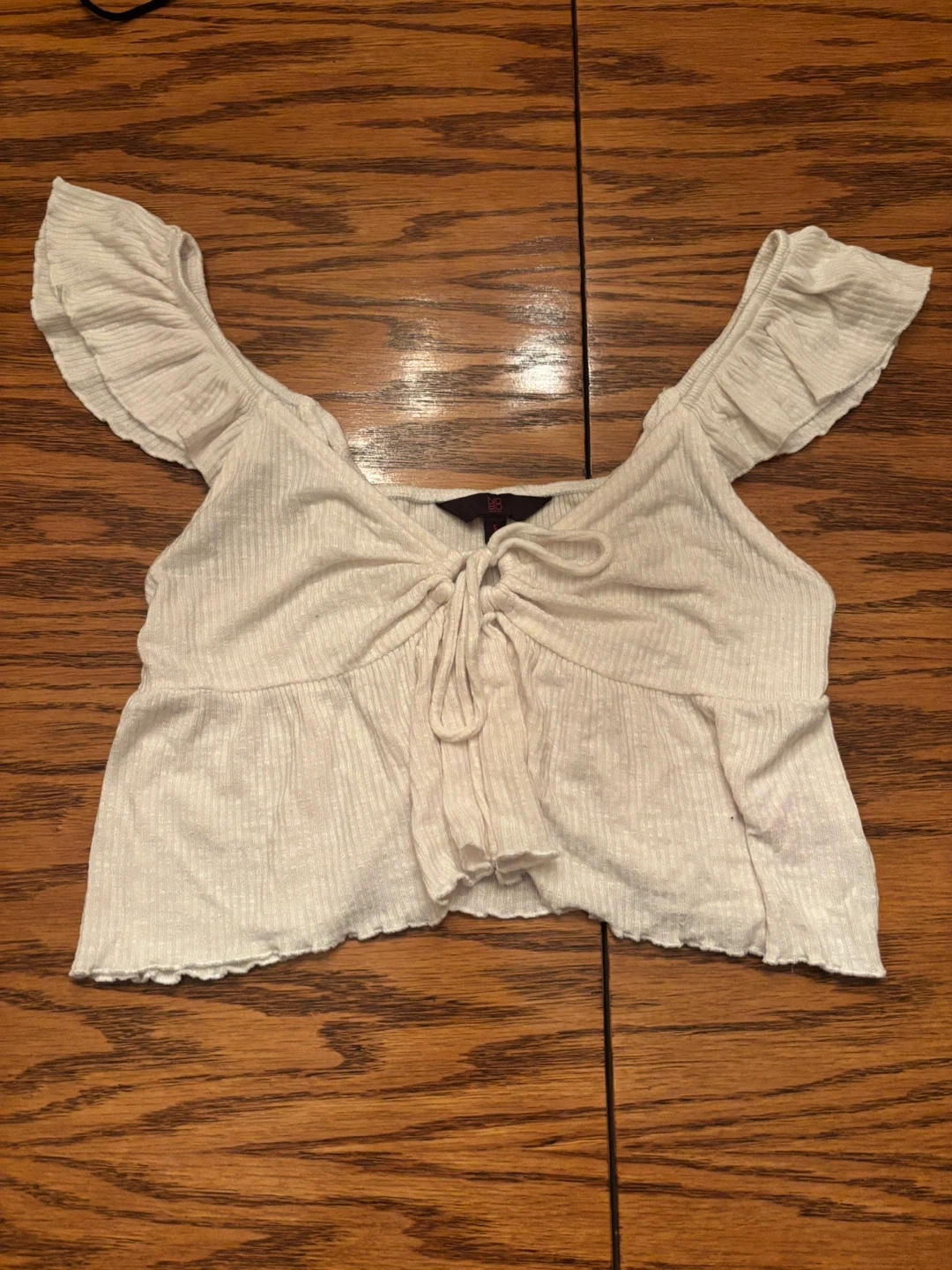 This white ribbed cropped top from NO BOUNDARIES features flutter sleeves and a tie front detail.