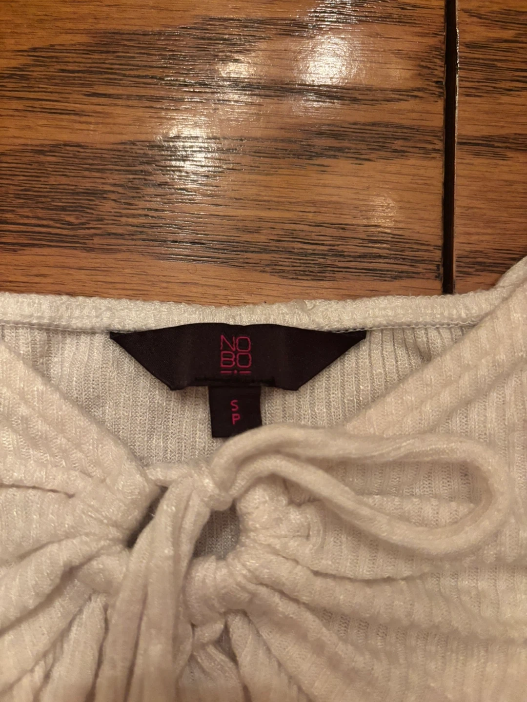 This white ribbed cropped top from NO BOUNDARIES features flutter sleeves and a tie front detail.
