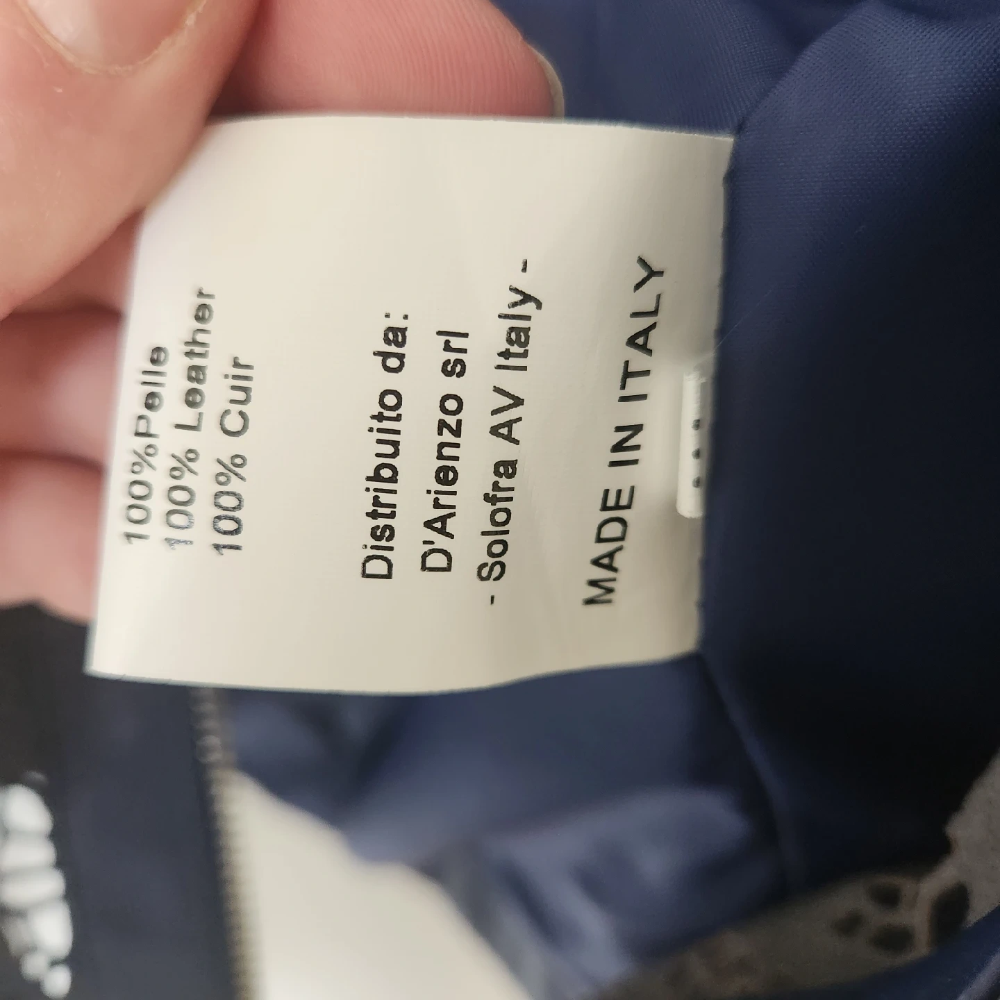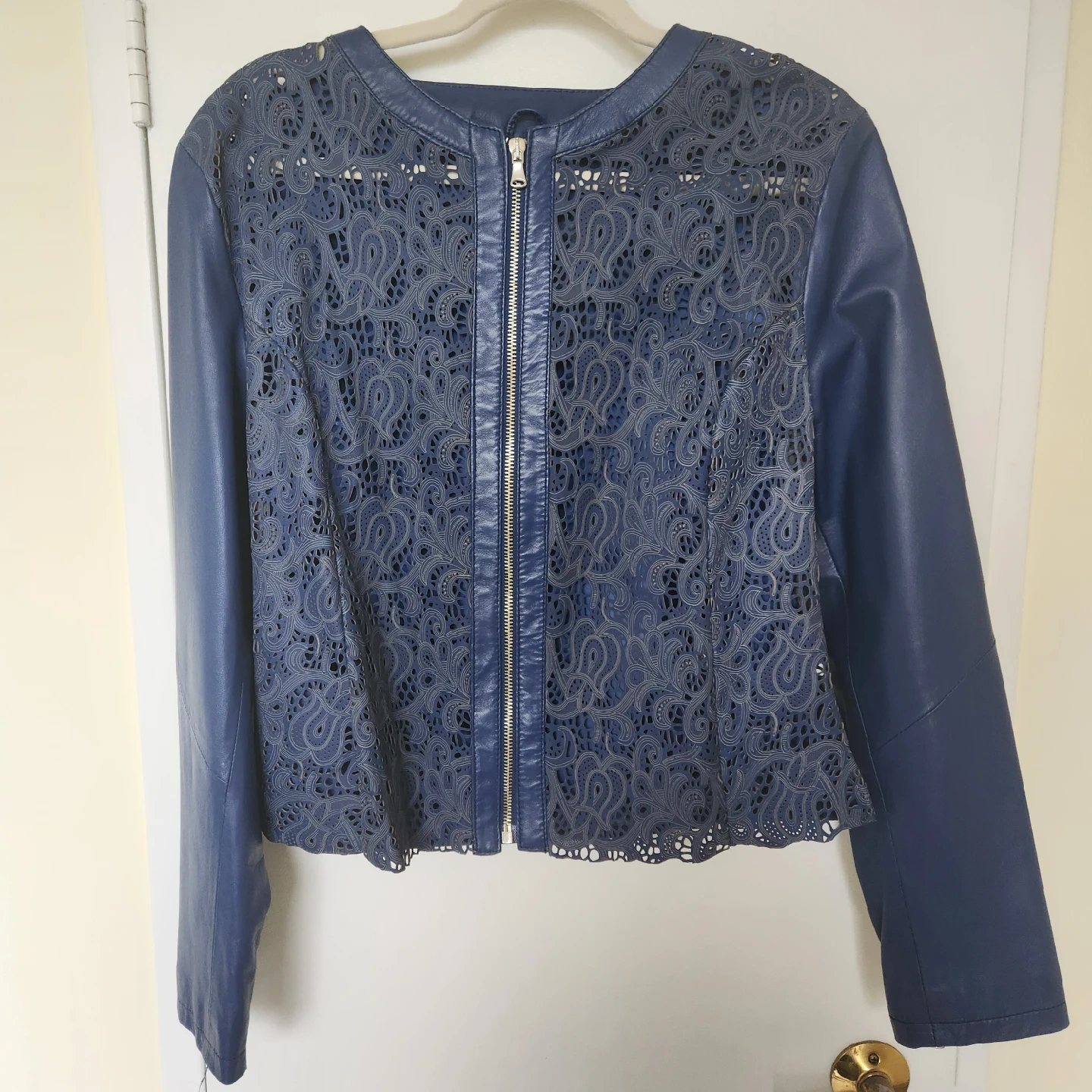 10D Collezioni Blue Leather Jacket Paisley Laser Cut Bright blue leather jacket. No collar. Zips up the front. Zipper detail at the wrists. Solid back with paisley laser cut detail in the front. Made in Italy Fits a size M/L Pit to pit: 46cm, Length: 56cm