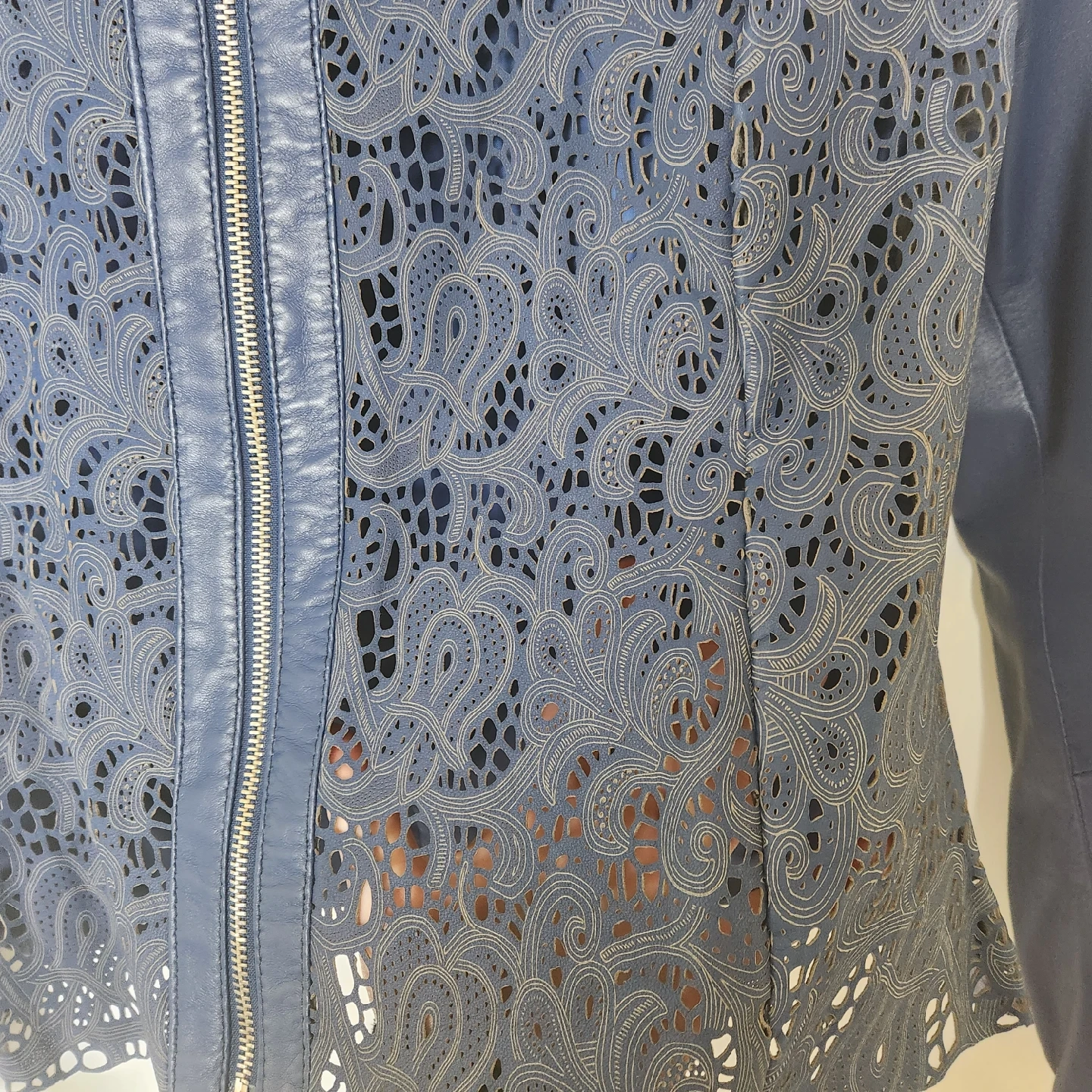 D Collezioni Blue Leather Jacket Paisley Laser Cut