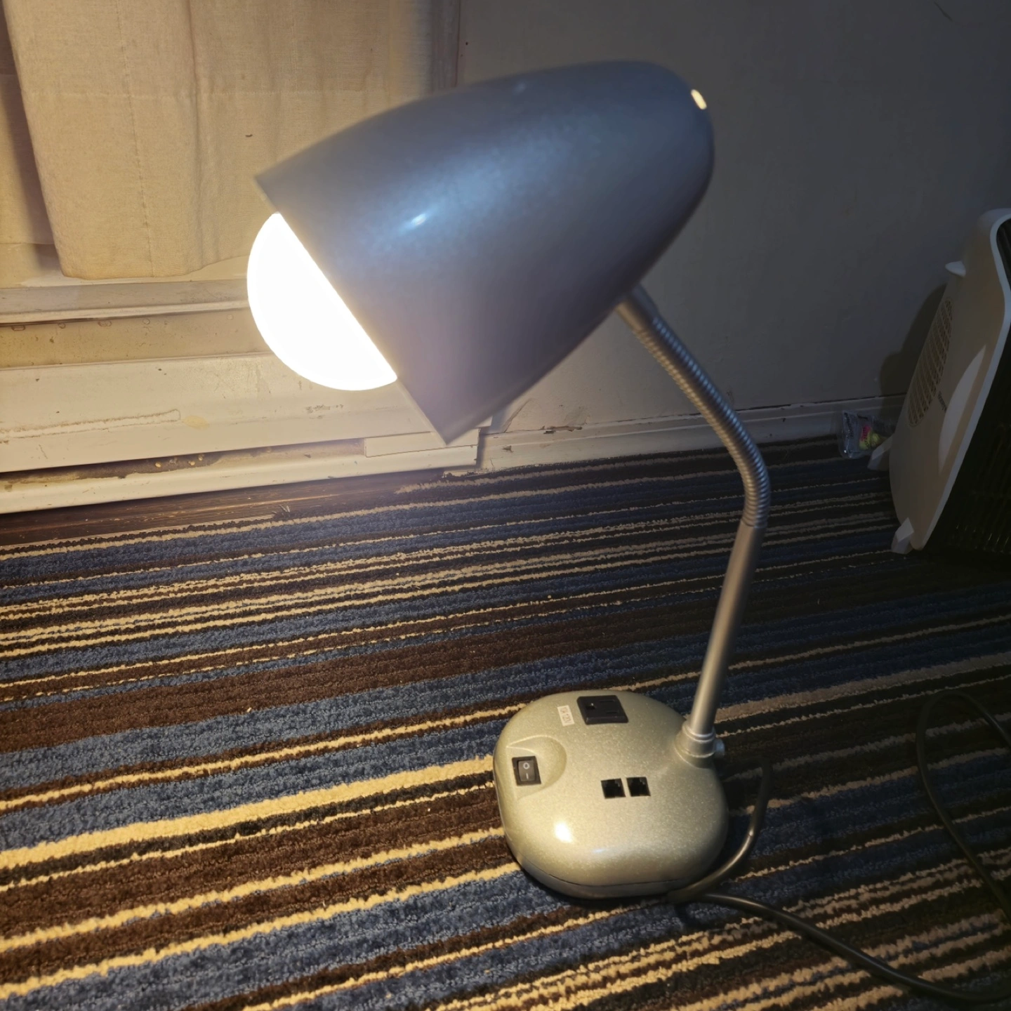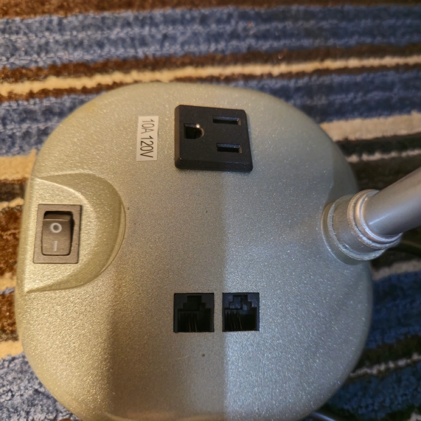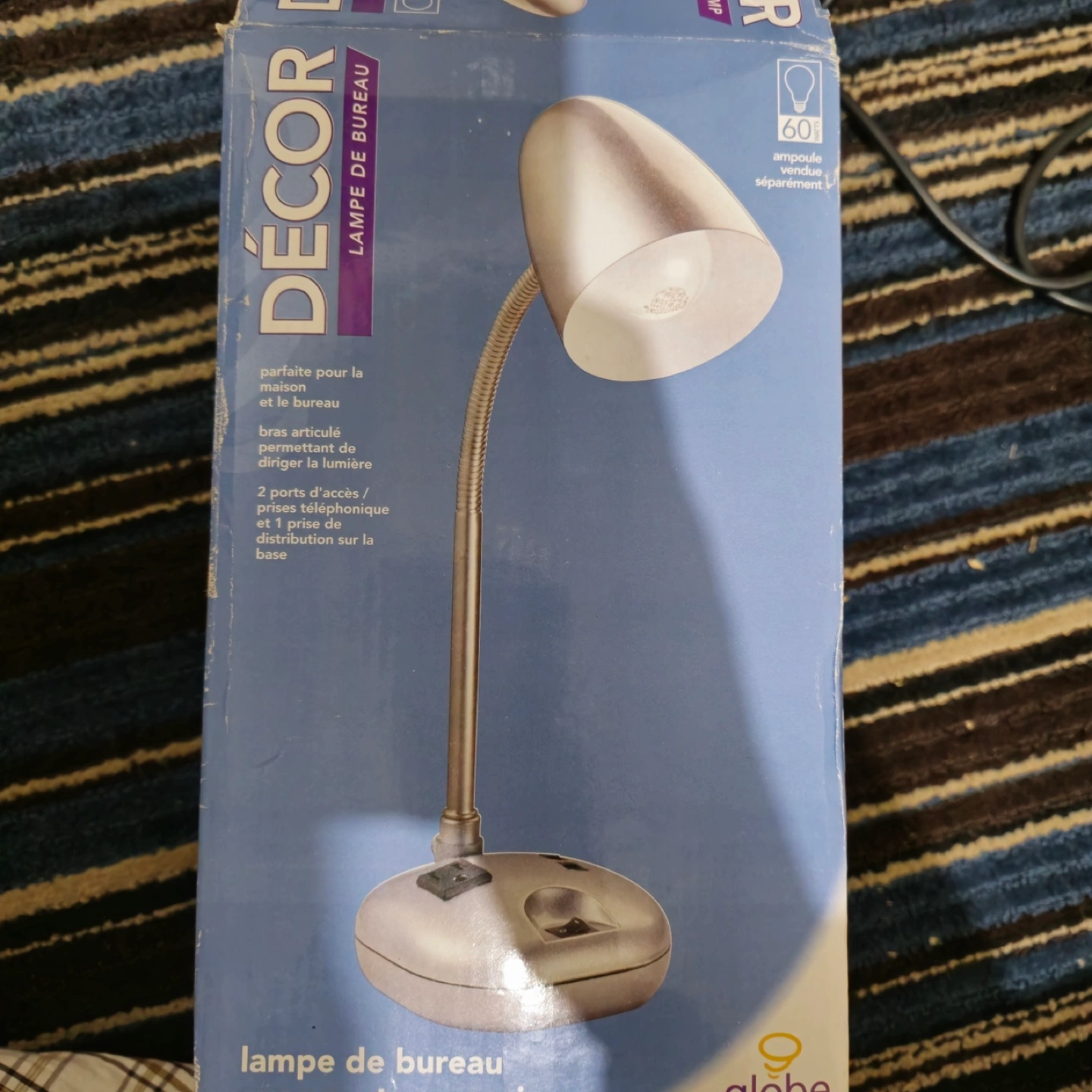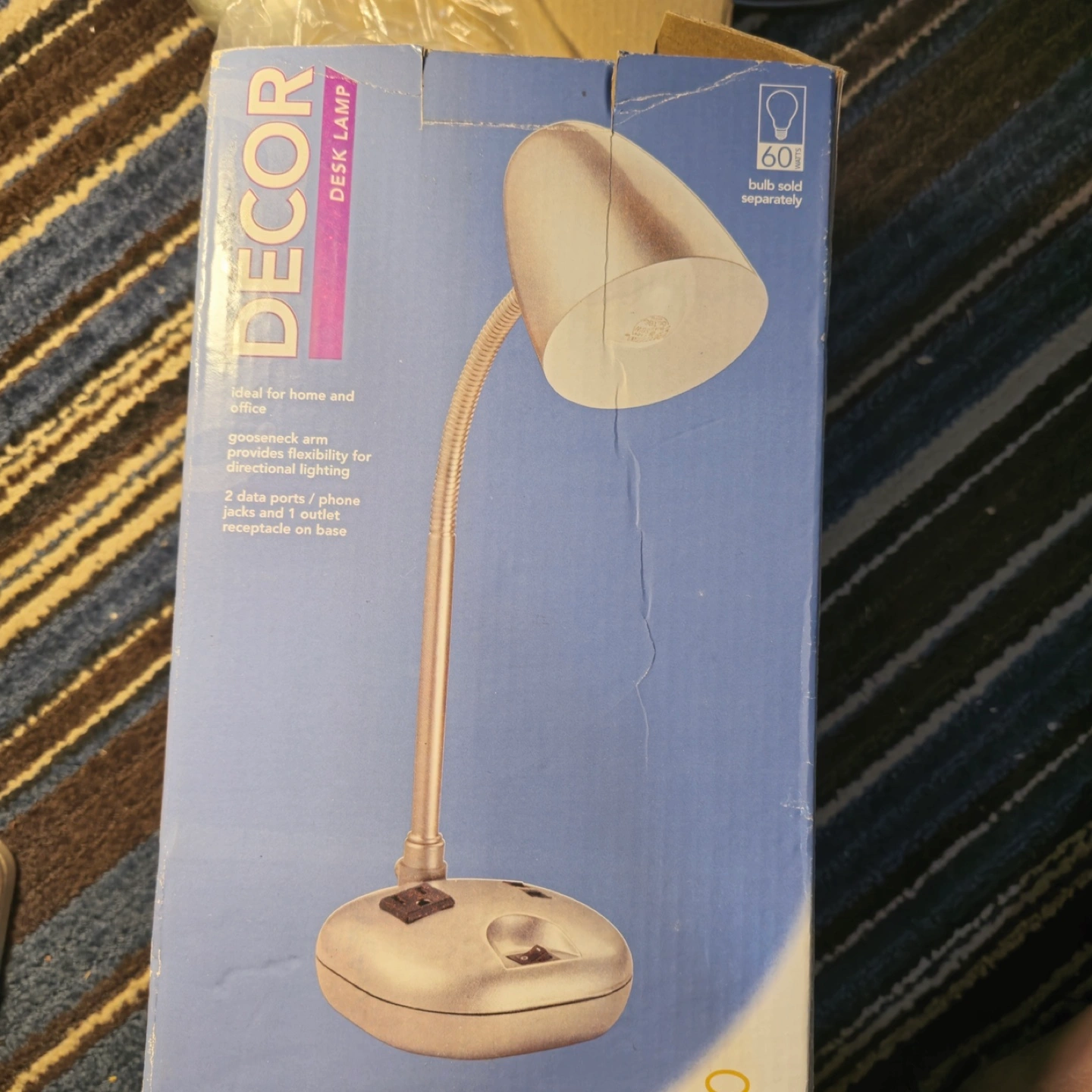 Selling a Décor desk lamp! It's perfect for home or office use. - Gooseneck arm allows for directional lighting - Base includes 2 data ports/phone jacks and 1 outlet receptacle - Bulb sold separately