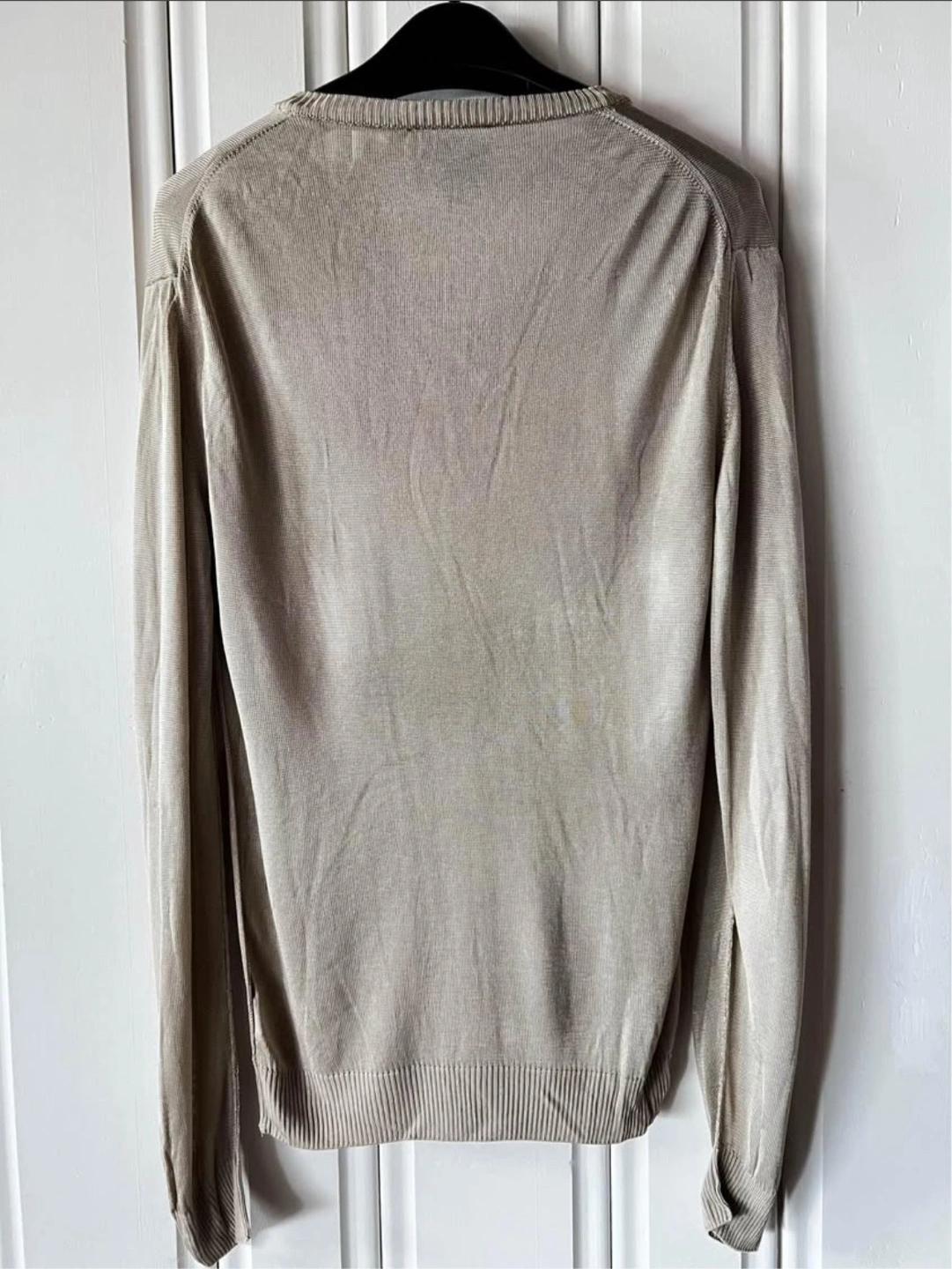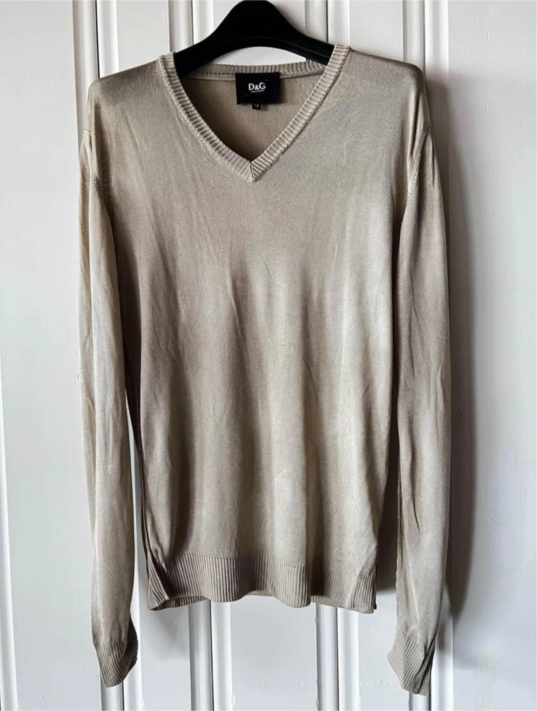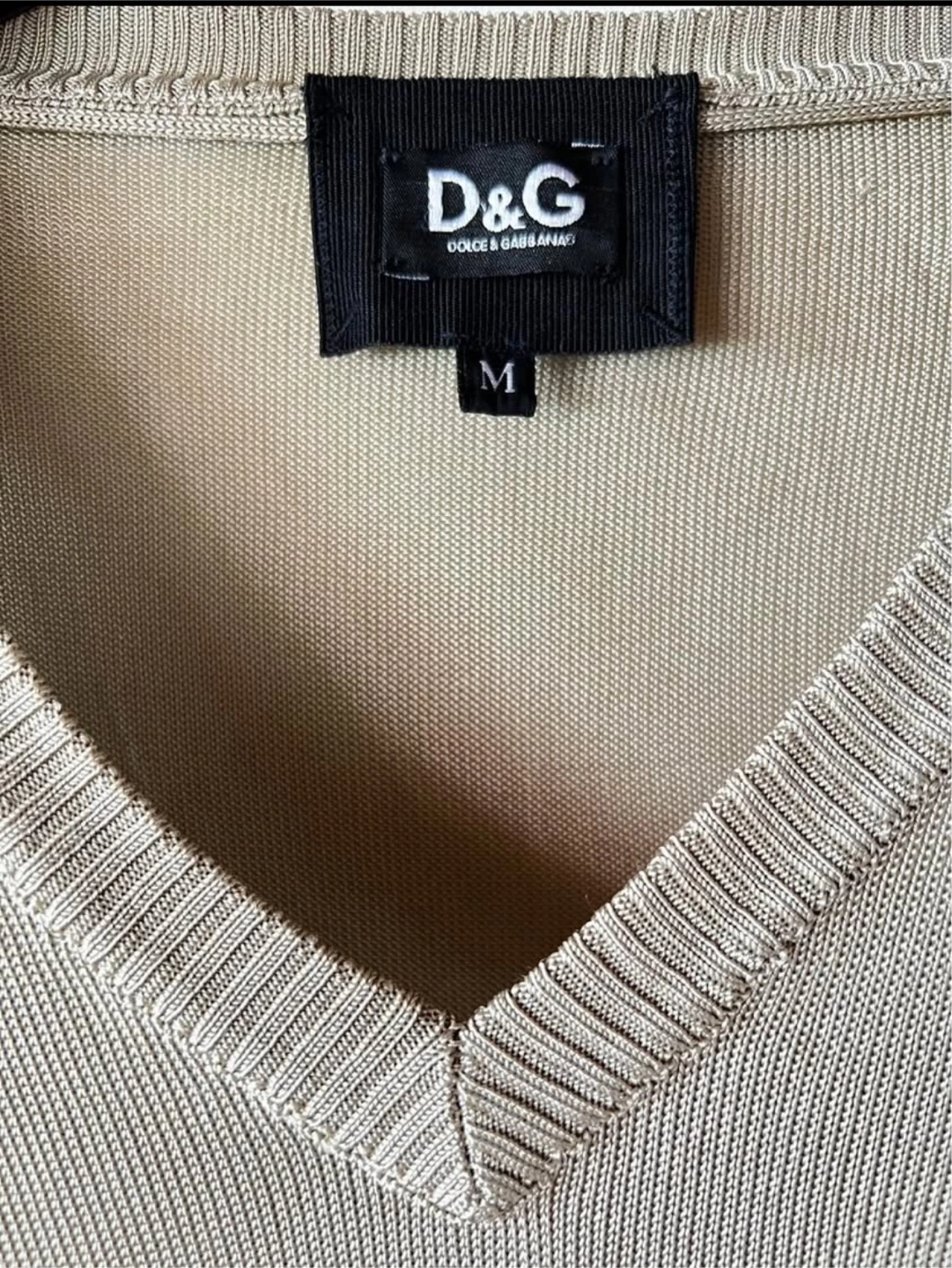 Here's a gently used Dolce&Gabbana V-neck sweater up for grabs! It's a size M and made of 100% viscose, slightly see through, Heavy Silk/knit material, making it super comfy and breathable. The neutral gold/beige colour is easy to match with anything in your wardrobe. Perfect for layering or wearing on its own!