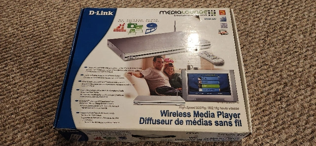 15D-Link MediaLounge Entertainment Network (DSM-320) The D-Link DSM-320 Wireless Media Player wirelessly streams music, photos, slideshows, and videos from a PC to your home entertainment center. You can easily access content from your PC or Network Attached Storage2 using a wireless 802.11g or 10/100 Ethernet connection. You can even listen to Internet radio stations or enjoy downloaded music all from the comfort of your living room. This is brand new in the box, never used--it is a hardware wireless (54Mbps) media player which can be used to do the following: - Stream PC and online media content to your entertainment centre (via LAN or wireless) - Listen to digital music on your stereo system - view slideshows and digital photos or video on your TV - Access media from other UPnP AV compliant media - Supports most popular media file formats which are split into three categories: Audio, Video and Photo. Audio files include: AIFF, MP3, OGG, WAV and WMA; Video formats are: DAT, MPEG1/2/4, AVI, QuickTime, Xvid, Picture types are: JPEG, JPEG2000, TIFF, GIF, BMP and PNG - Watch a slideshow while simultaneously playing your favourite songs - Sit /n Click through on-screen menu selections via remote control (included) Comes with all documentation and cables (network, power, audio) and remote control (batteries not included). Asking $110