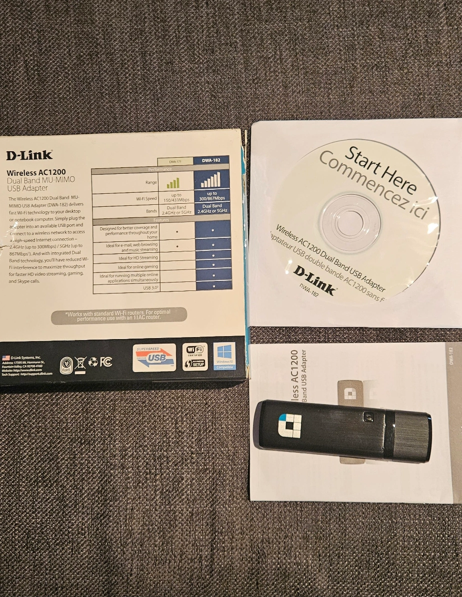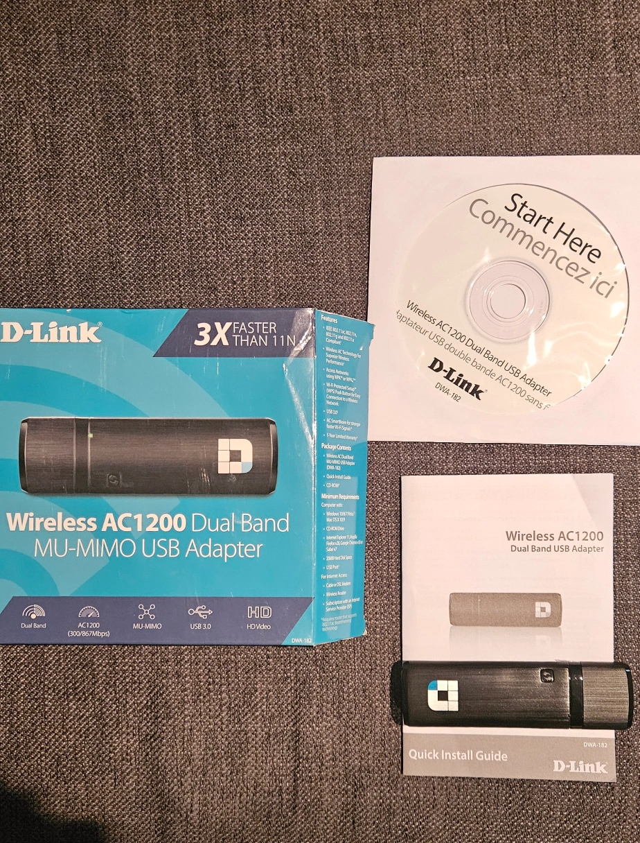 Selling a D-Link Wireless AC1200 Dual Band MU-MIMO USB Adapter (DWA-182). It delivers fast Wi-Fi technology to your computer. Simply plug the adapter into an available USB port and you'll be able to connect to access a high-speed internet connection. Designed for better coverage and speed. Ideal for e-mail, web browsing, and HD streaming. Comes with the box, CD, and quick install guide