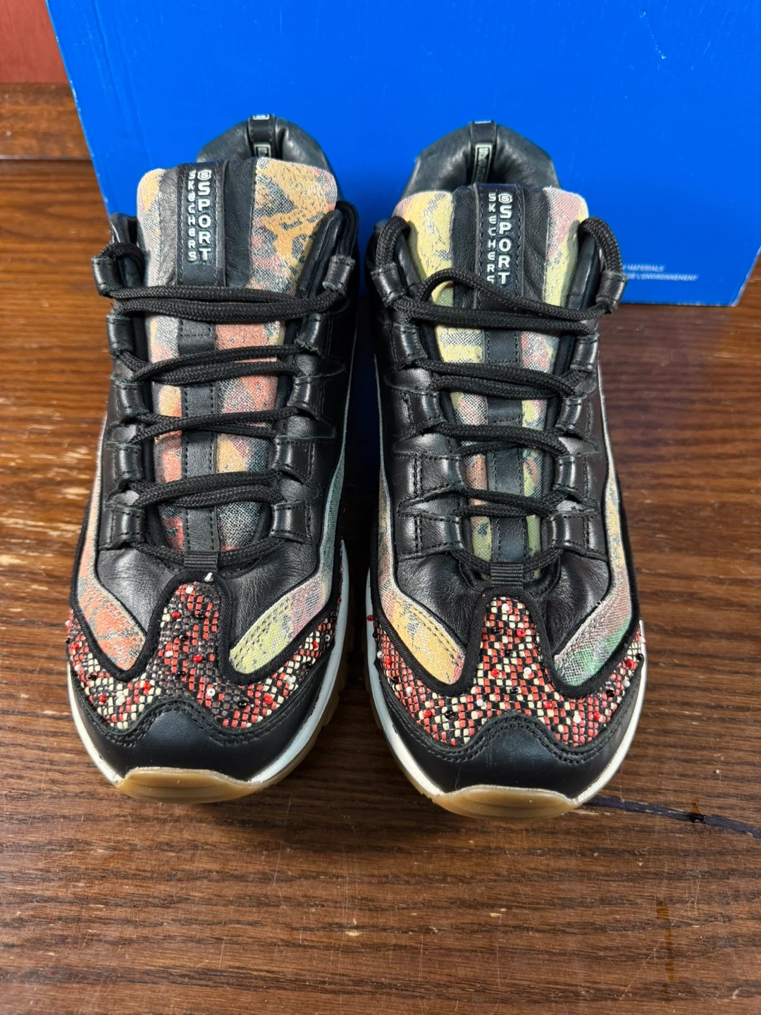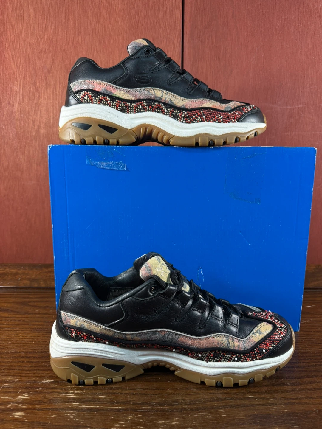 These Skechers sneakers feature a black leather upper with colourful patterned accents.