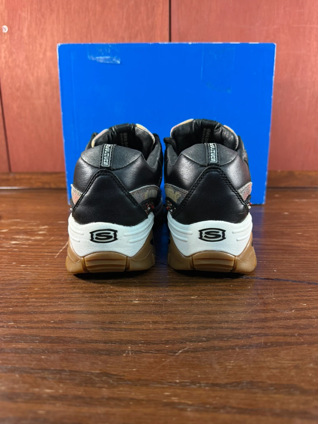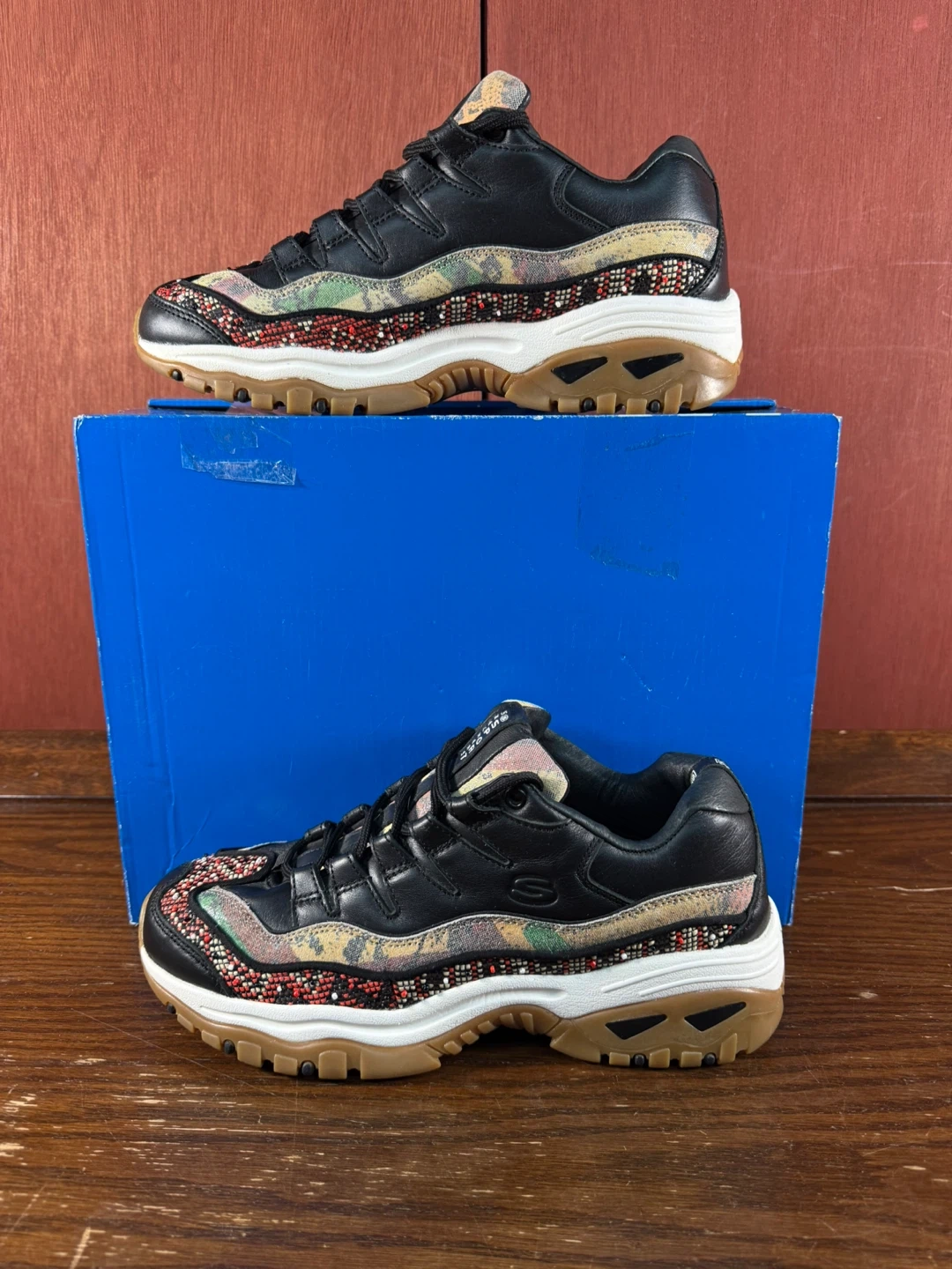 These Skechers sneakers feature a black leather upper with colourful patterned accents.
