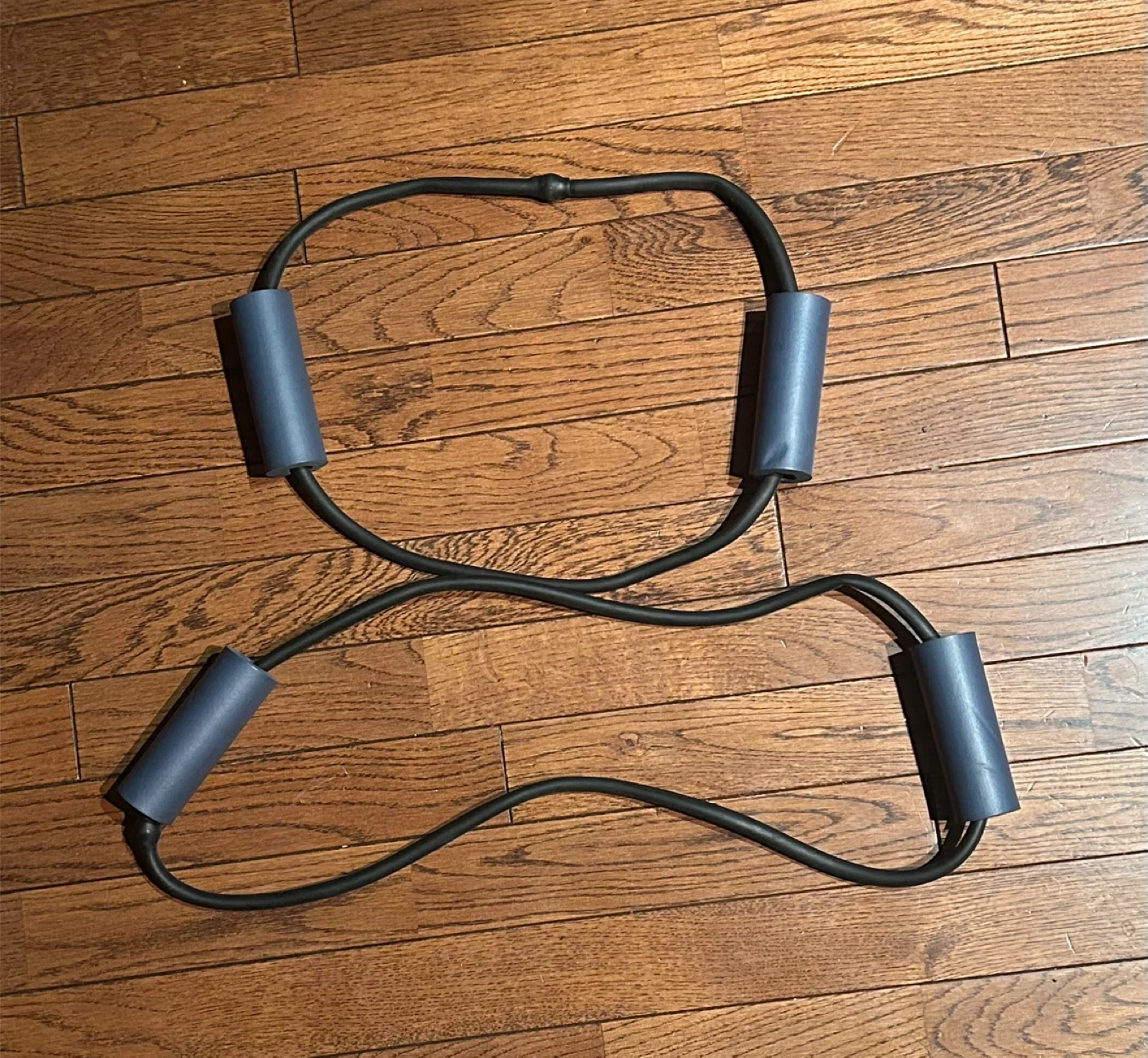 This is a resistance band designed for exercise. It features black elastic tubing with blue padded handles for a comfortable grip. The band is made of durable rubber for effective workouts. It's great for strength training and rehabilitation exercises.