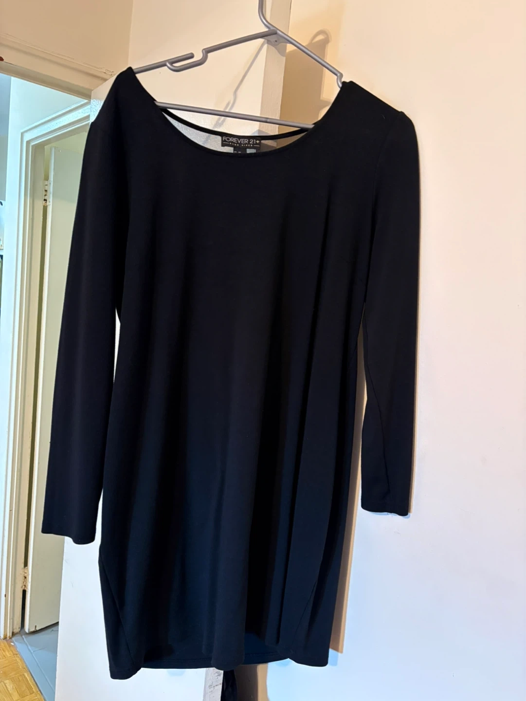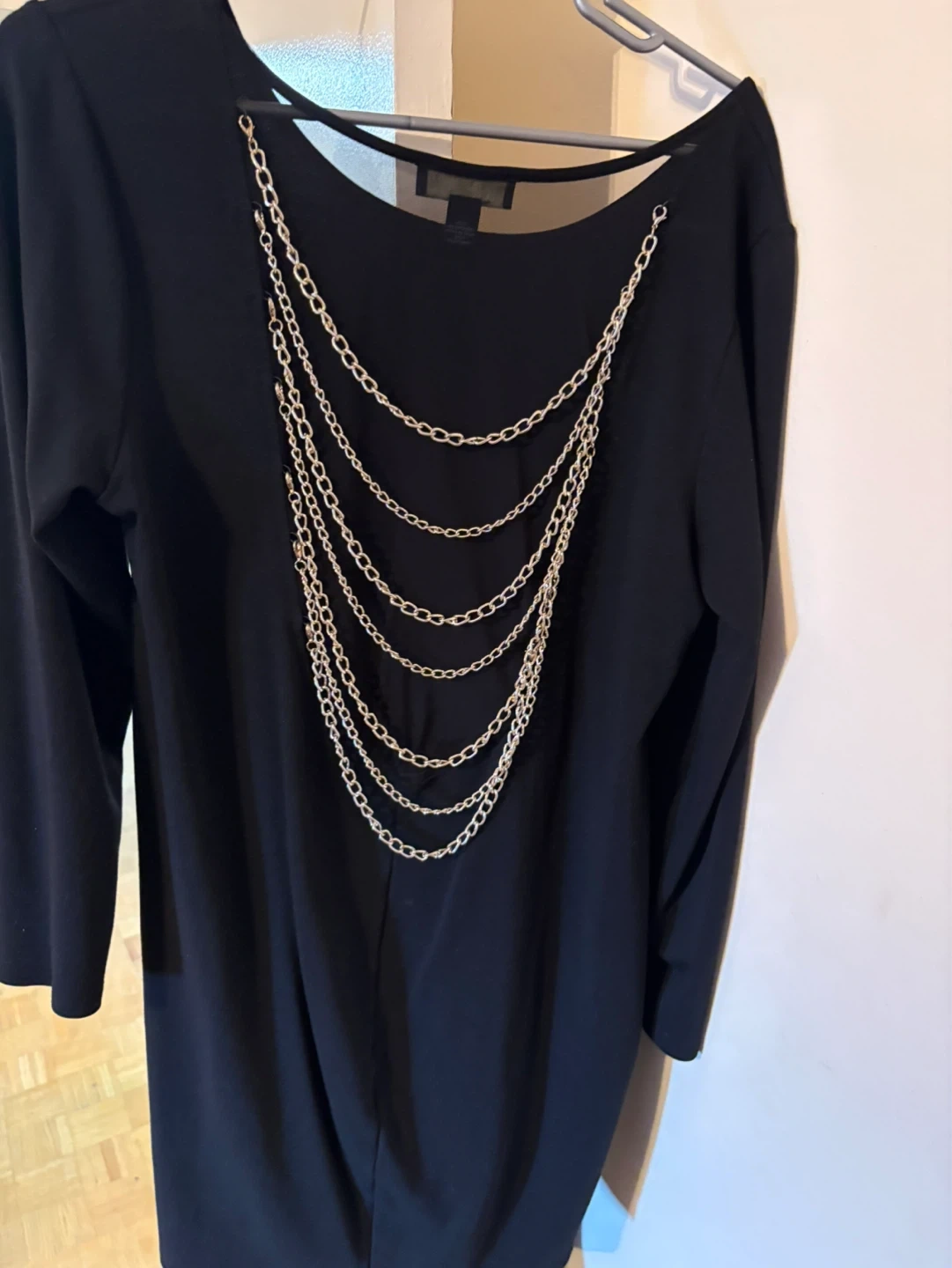 This black dress from Forever 21+ features a unique silver chain detail across the back. It's a size 3X (US) and has long sleeves. The fabric is soft and stretchy, making it comfy for all-day wear.