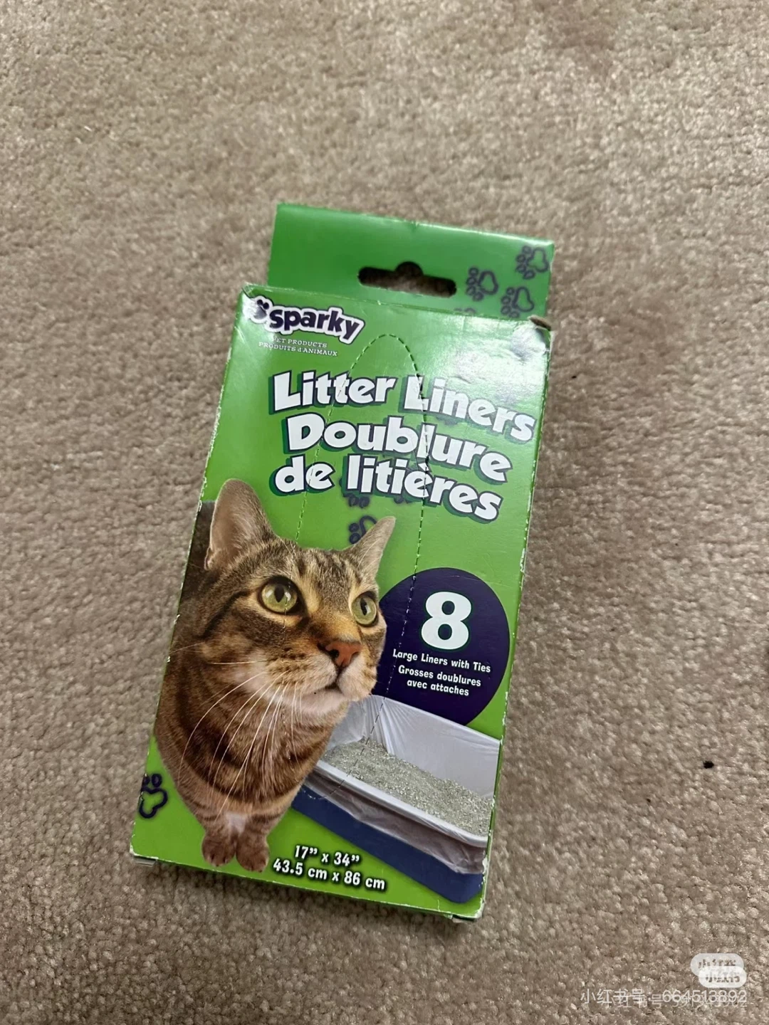 Sparky brand large litter liners. Comes with 8 liners and ties. Dimensions are 17" x 34" (43.5 cm x 86 cm). Easy way to keep your litter box clean!