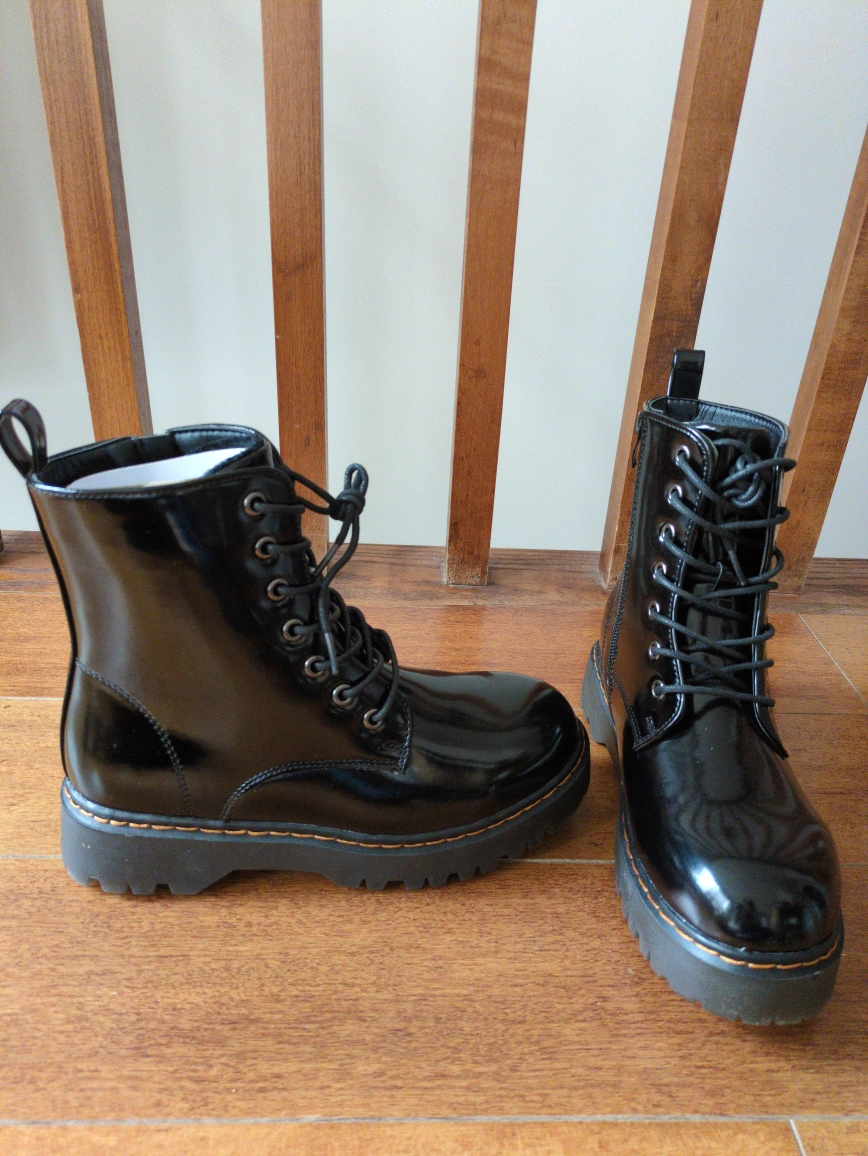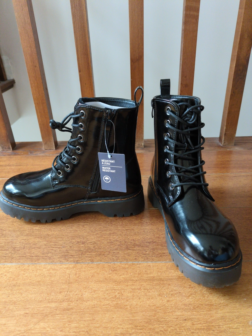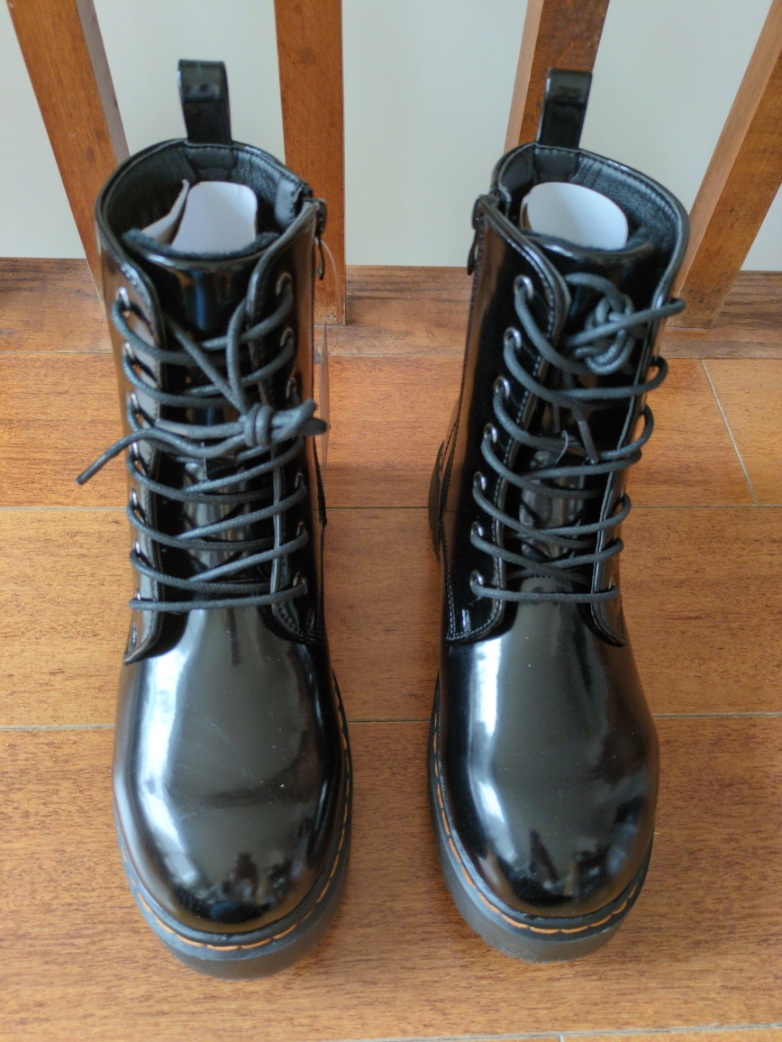 Brand new Combat boots. Black patent leather. Lace-up style. Chunky platform sole. Water-resistant. Never worn.