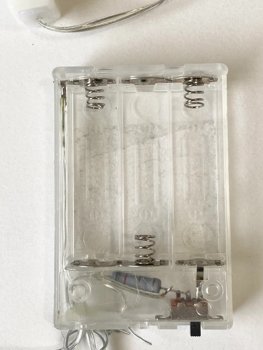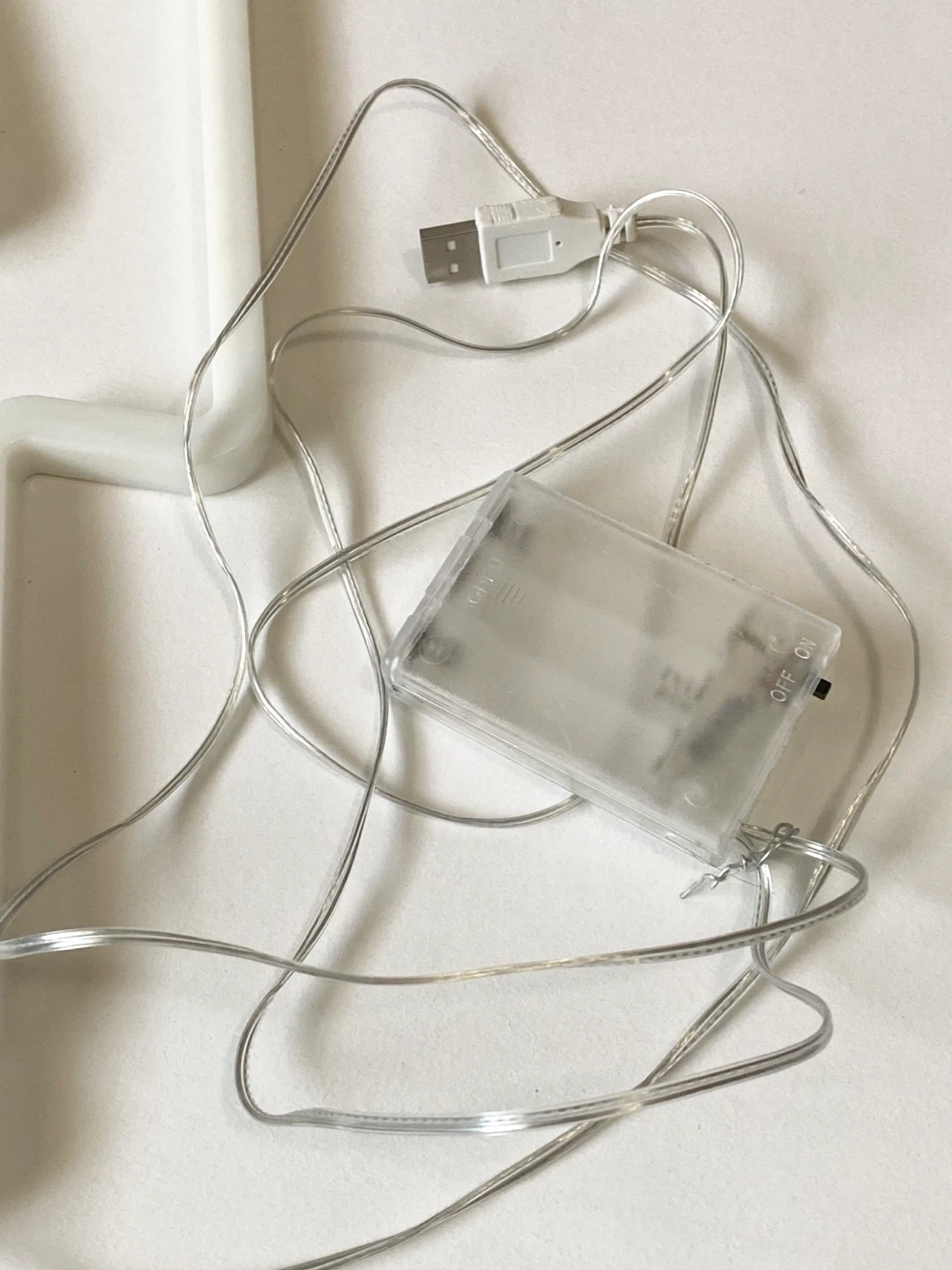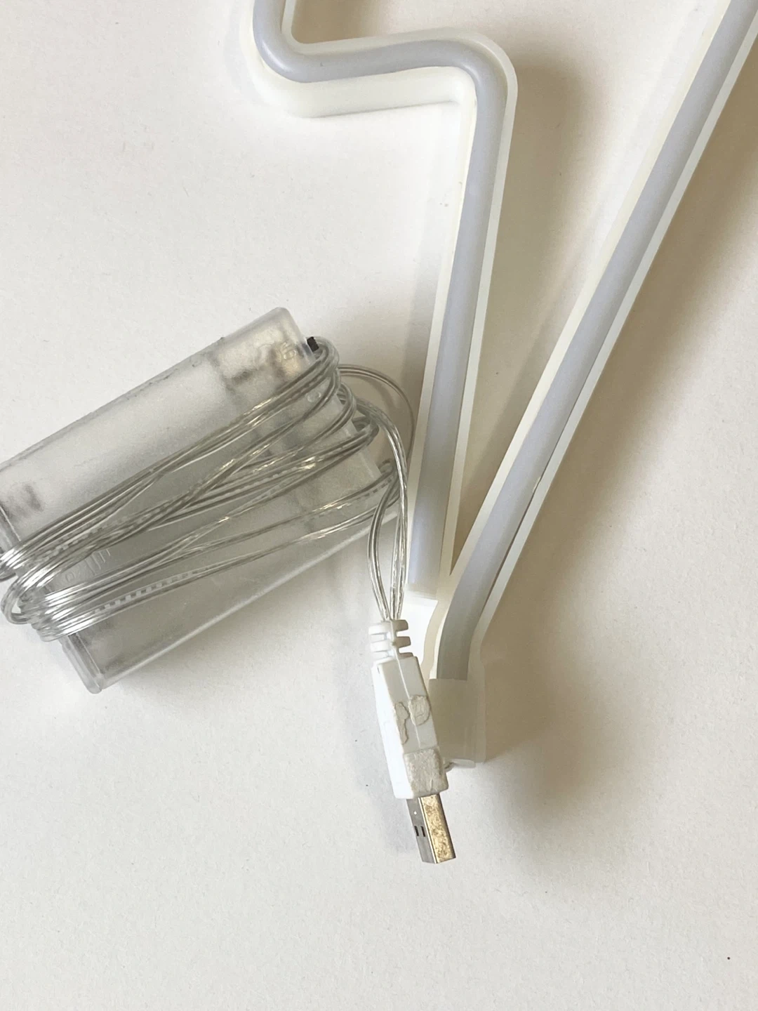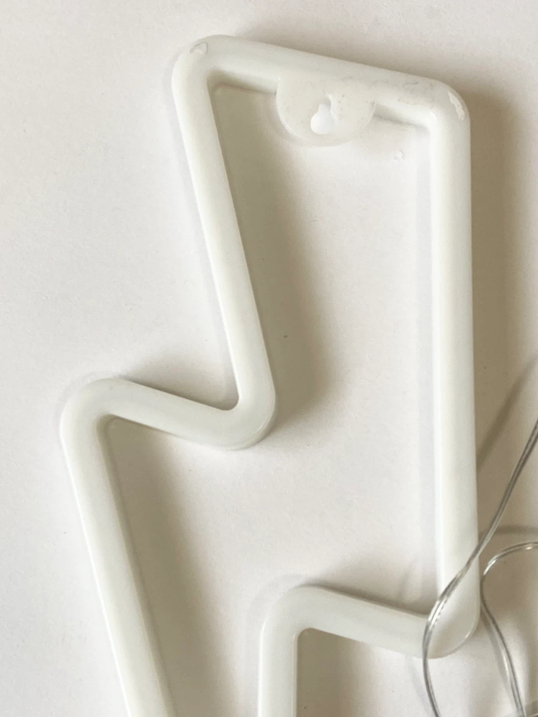 This is a bolt-shaped LED neon sign light. It's powered by USB and includes a battery pack. White in colour. The battery pack and some areas of the sign have adhesive on it from tape.
