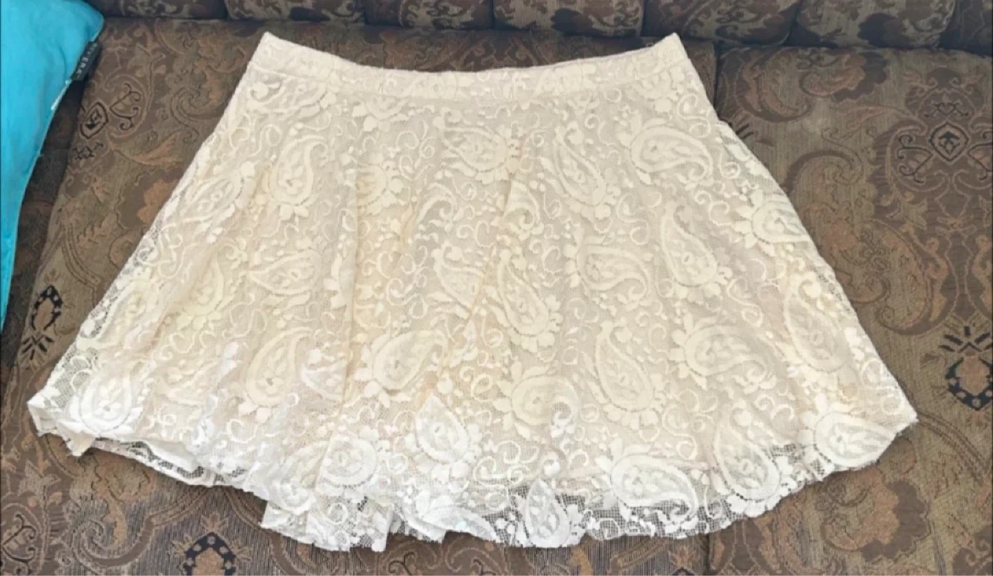 Pretty cream-coloured lace skirt with a paisley pattern. It's a flirty skater style that would be great for summer events. Material is lace.