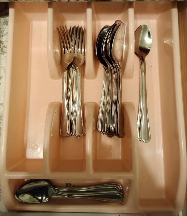 Set of silverware, forks and spoons in a pink cutlery tray.