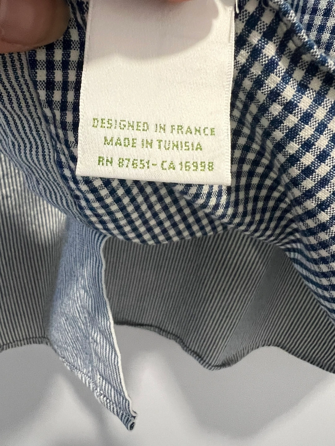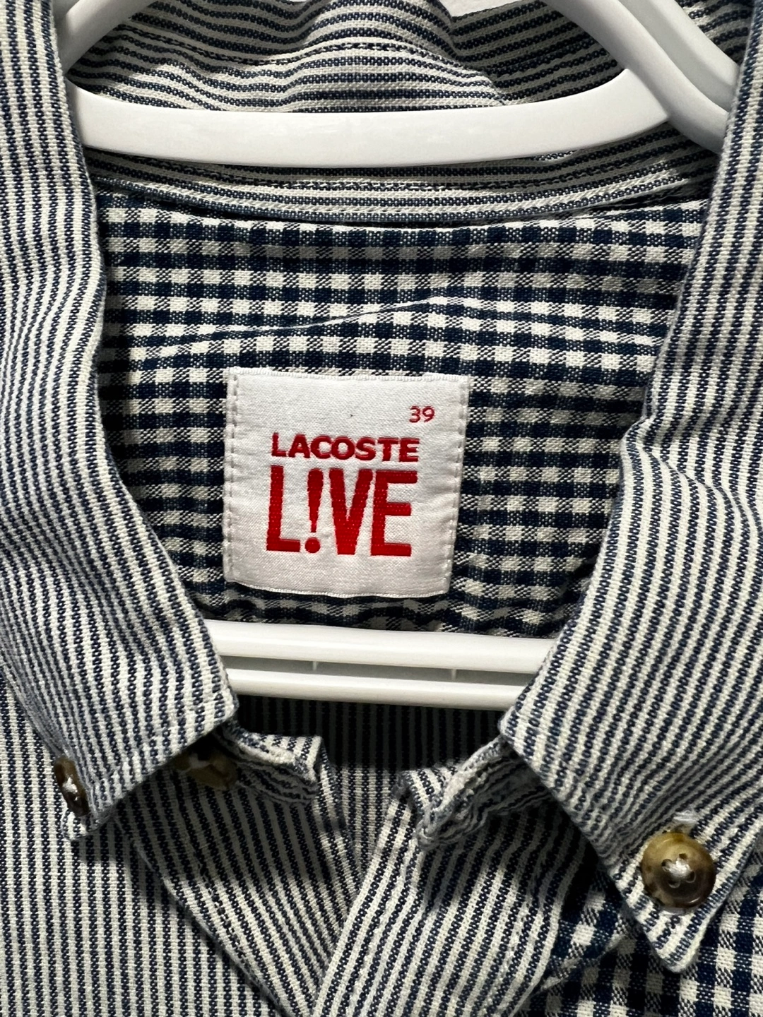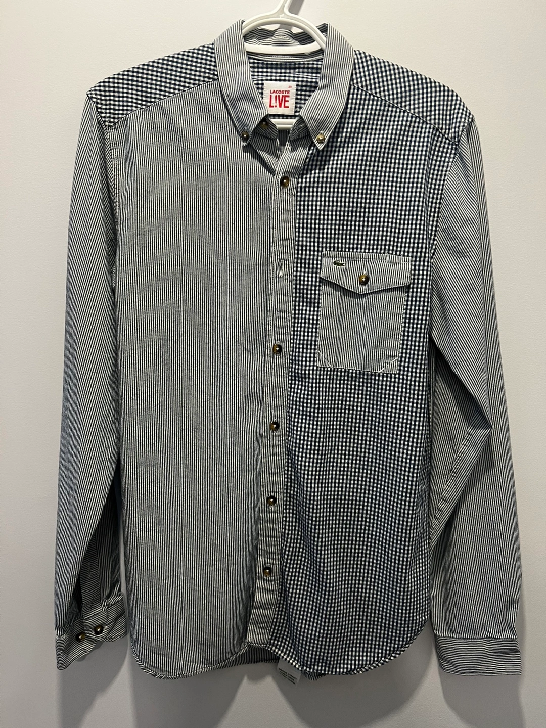 Patchwork button-up shirt from Lacoste Live. Features a mix of navy and white gingham and pinstripe patterns. Designed in France and made in Tunisia. Size 39.