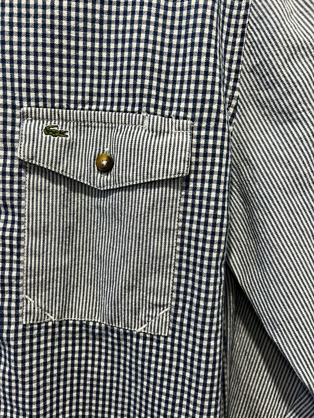 Patchwork button-up shirt from Lacoste Live. Features a mix of navy and white gingham and pinstripe patterns. Designed in France and made in Tunisia. Size 39.