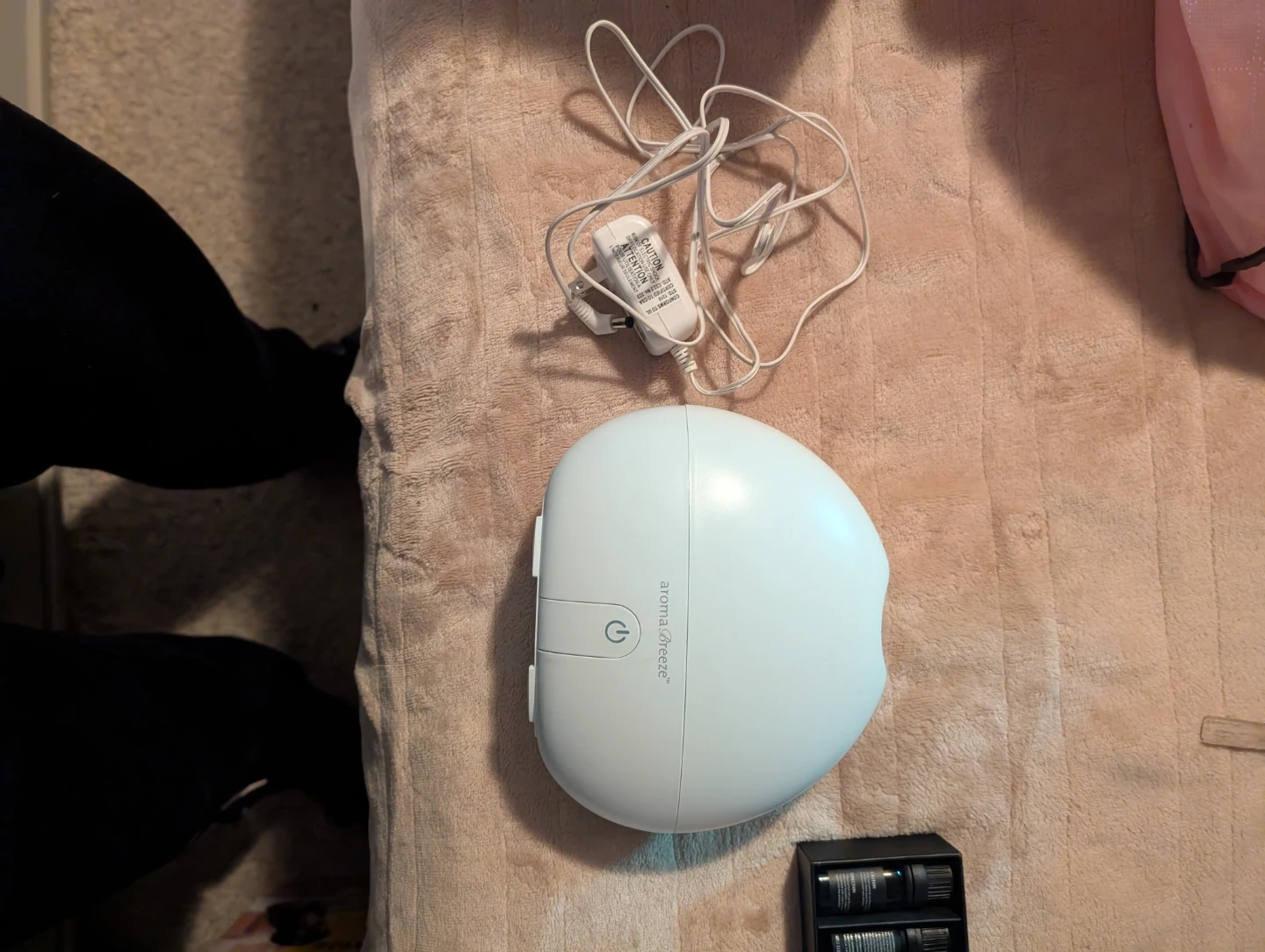 This Aroma Breeze diffuser comes with a set of essential oils, including lavender. It's a great way to add a relaxing scent to your home. The set includes the diffuser, essential oil bottles, and a power adapter.