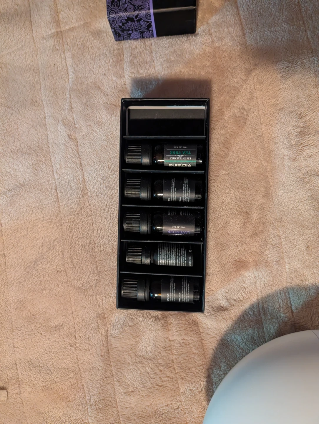 This Aroma Breeze diffuser comes with a set of essential oils, including lavender. It's a great way to add a relaxing scent to your home. The set includes the diffuser, essential oil bottles, and a power adapter.